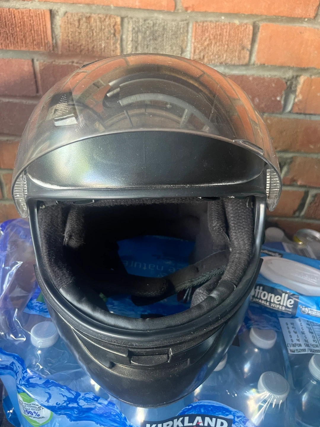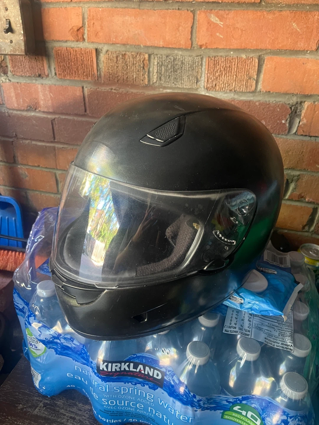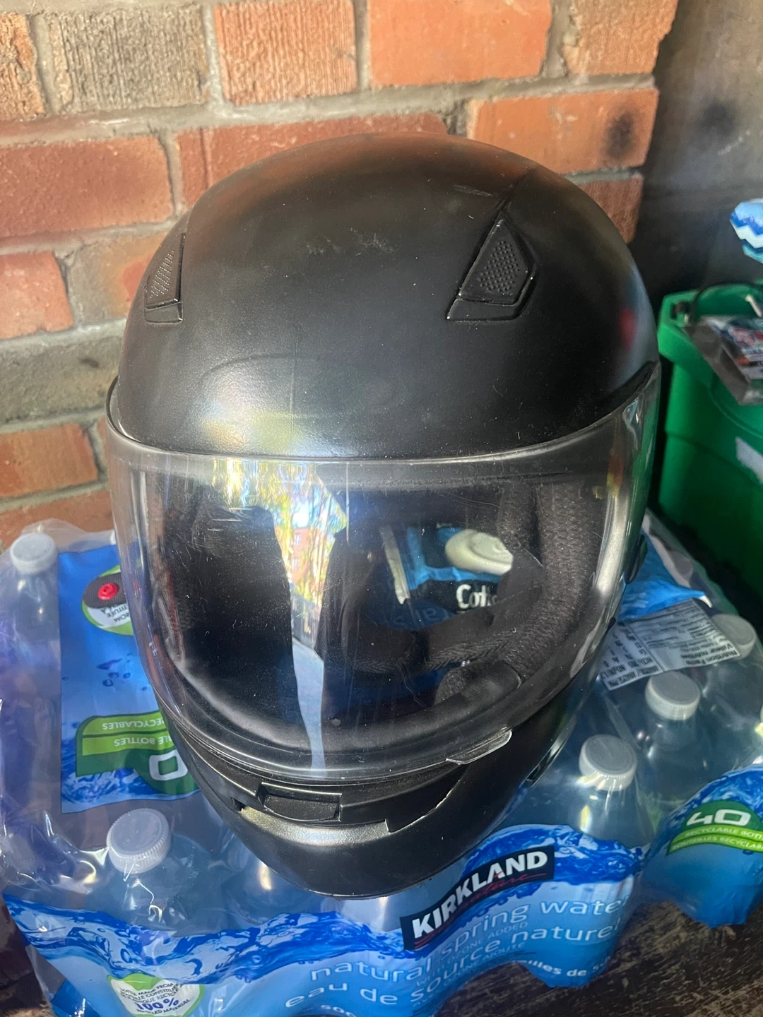 Selling a black motorcycle helmet. It's in good condition and ready for the road! Perfect for anyone looking for a reliable helmet.