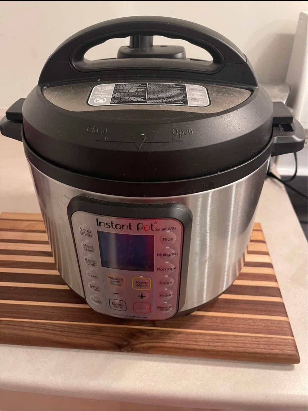 Selling an Instant Pot Smart WiFi pressure cooker in good condition! It comes with the accessories shown in the photos, including a measuring cup, two spoons, and a steaming rack. It's a versatile appliance that can handle everything from soup to yogurt