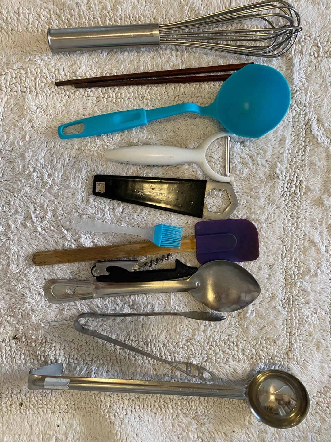 Selling a set of assorted kitchen utensils. Includes a whisk, chopsticks, blue spoon, peeler, bottle opener, spatula, brush, corkscrew, serving spoon, and tongs. All in good condition and ready for a new home!