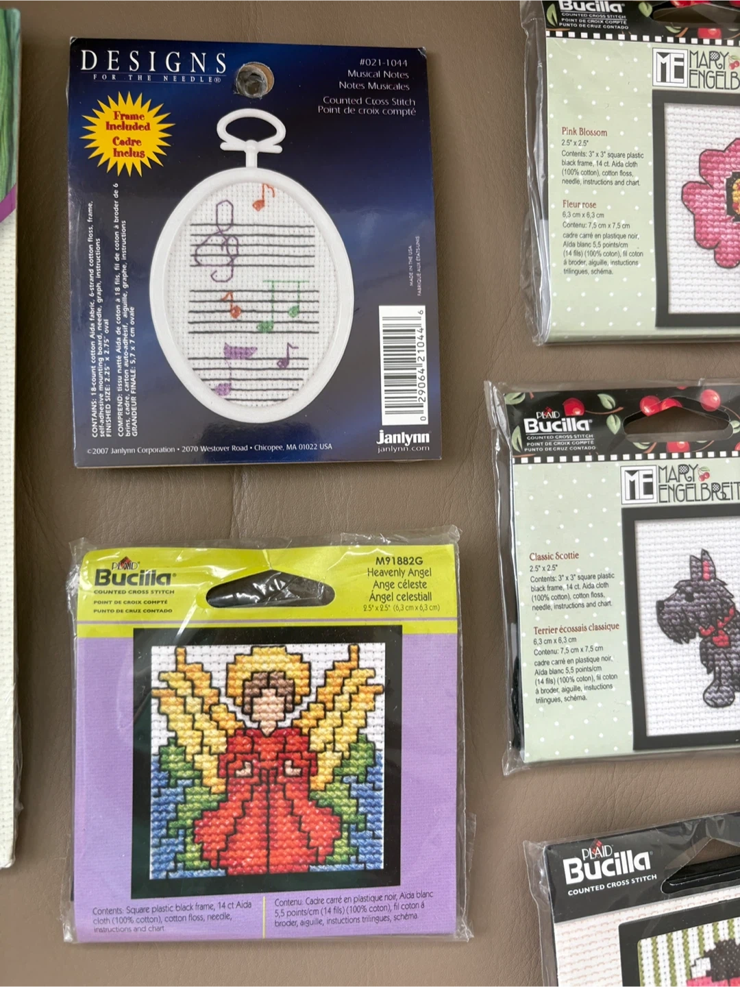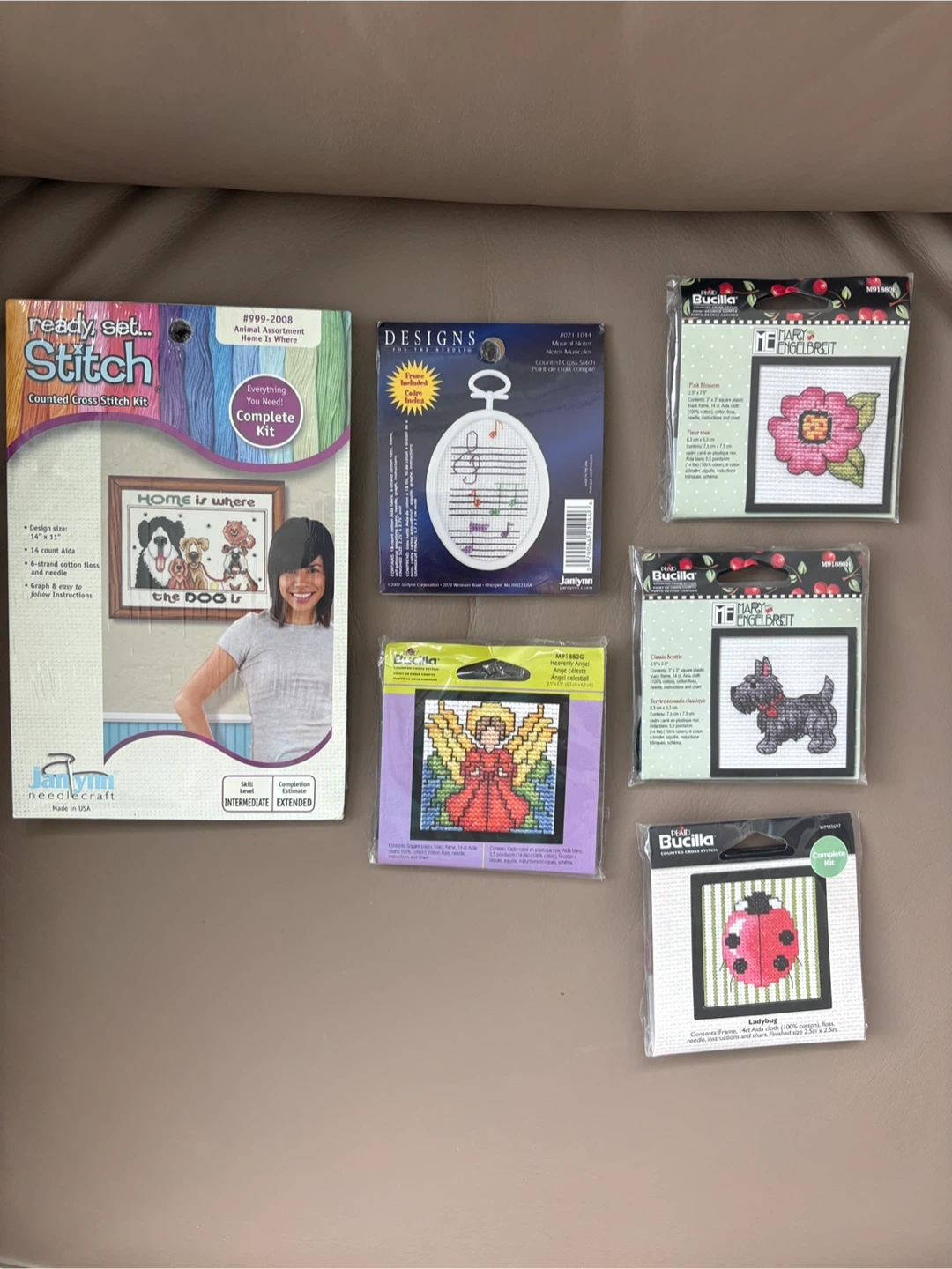 Selling a variety of cross stitch kits! Includes: - Janlynn Needlecraft Ready Set Stitch Animal Assortment - Designs for the Needle Musical Notes - Bucilla Pink Blossom - Bucilla Classic Scottie - Bucilla Heavenly Angel - Plaid Bucilla Ladybug All kits are complete and ready to stitch!