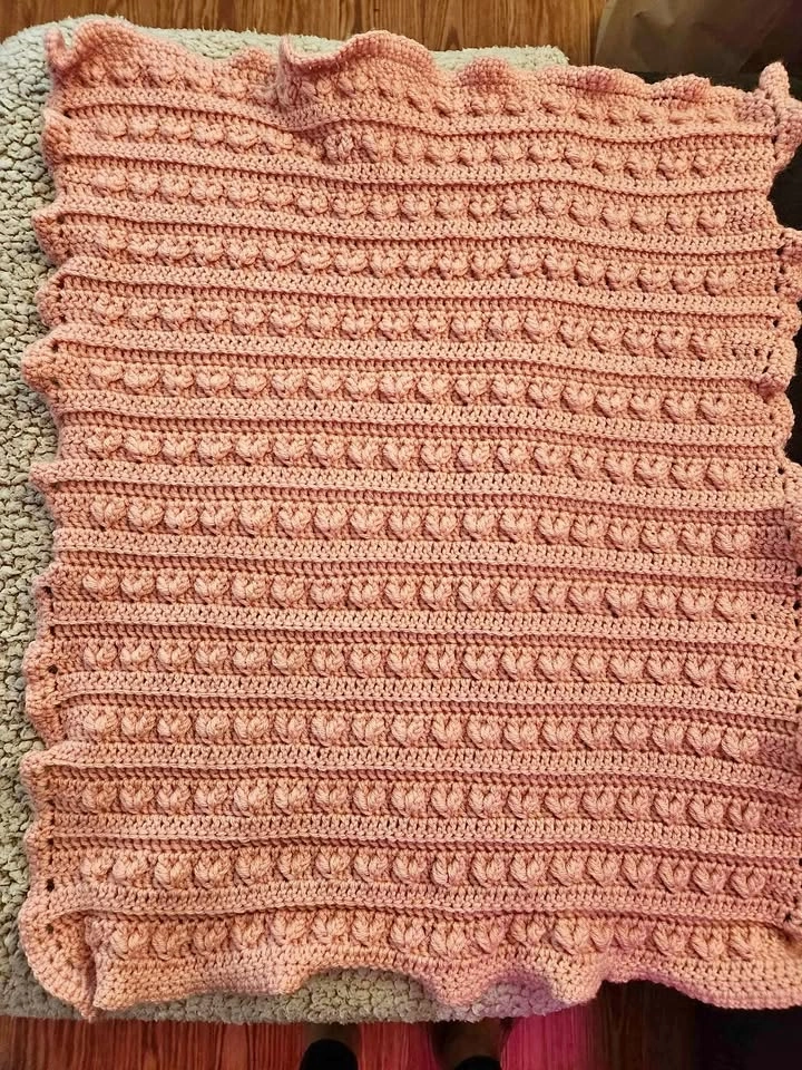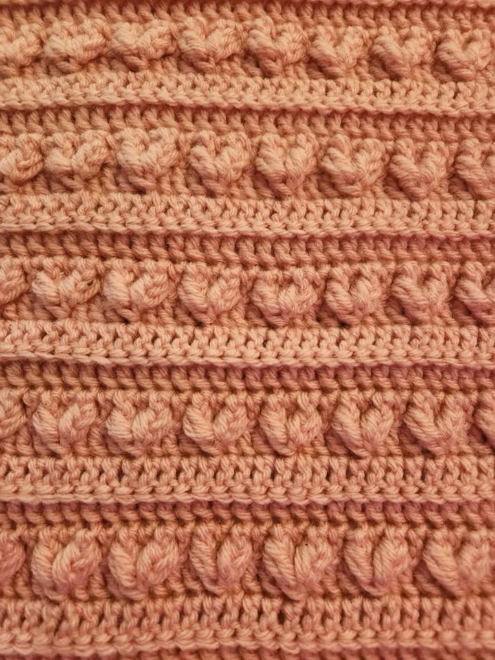 Dusty rose coloured, hand crocheted heart baby blanket.