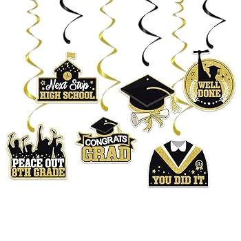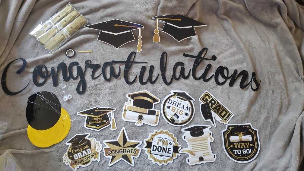 Selling a brand new graduation decoration set! It includes a 'Congratulations' banner, 9 swirl graduation-themed cutouts, and 6 tissue paper pom poms in black and gold. Perfect for celebrating a graduation! 5 available