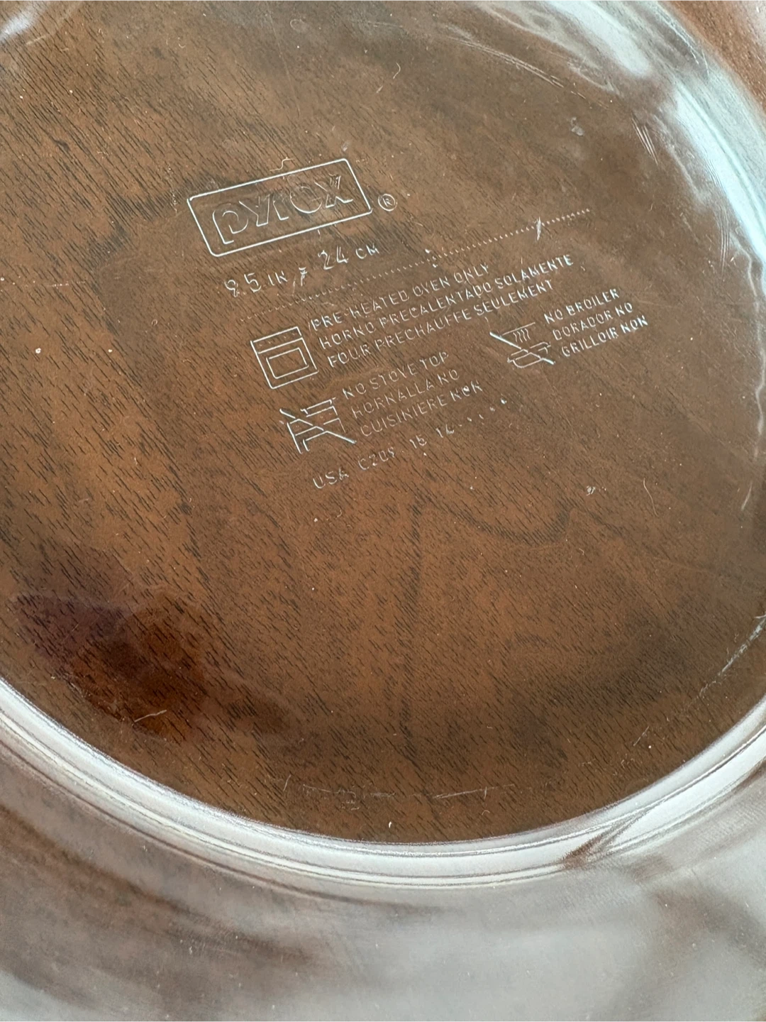 Pyrex pie dish in new condition, measures 9.5 inches in diameter.