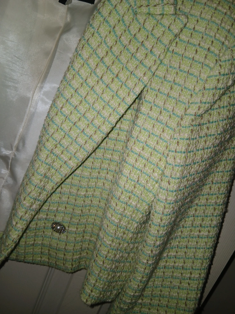 Selling a Zara cropped tweed blazer in excellent condition! The blazer is a size medium. It features a stylish tweed pattern in shades of green and cream. Perfect for adding a touch of sophistication to any outfit!