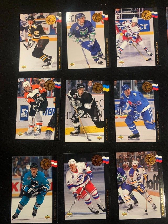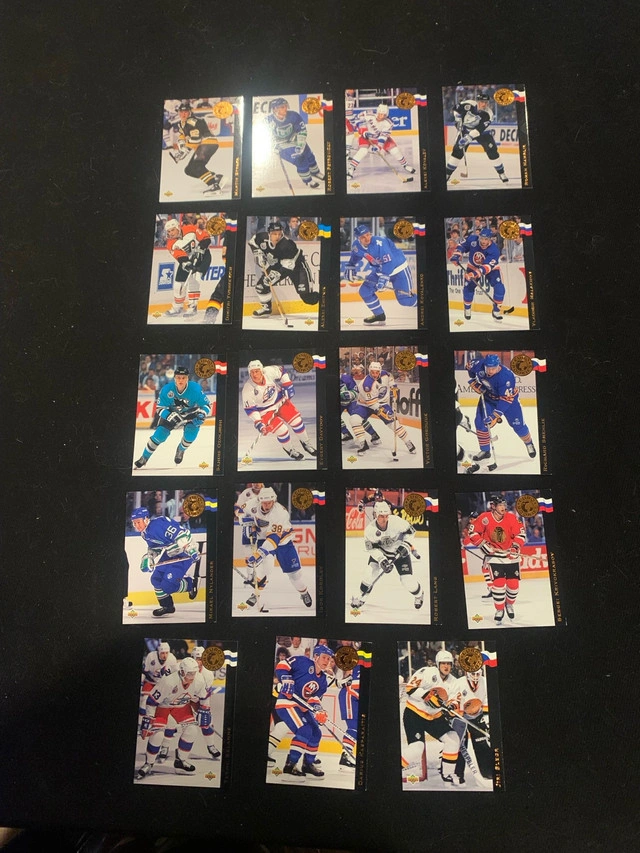 Up for grabs are these Upper Deck Euro Stars hockey cards. These cards are in great condition, perfect for any collector looking to add to their set. Although determining a precise market value is challenging, similar hockey cards can be found listed on Kijiji for around $5 per card. Given the condition and collectibility, I've priced them competitively. $30 OBO If you're seeing this ad, the cards are still available and waiting for a new home! Don't miss out!