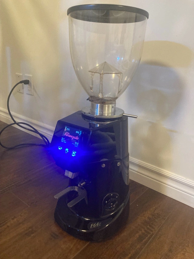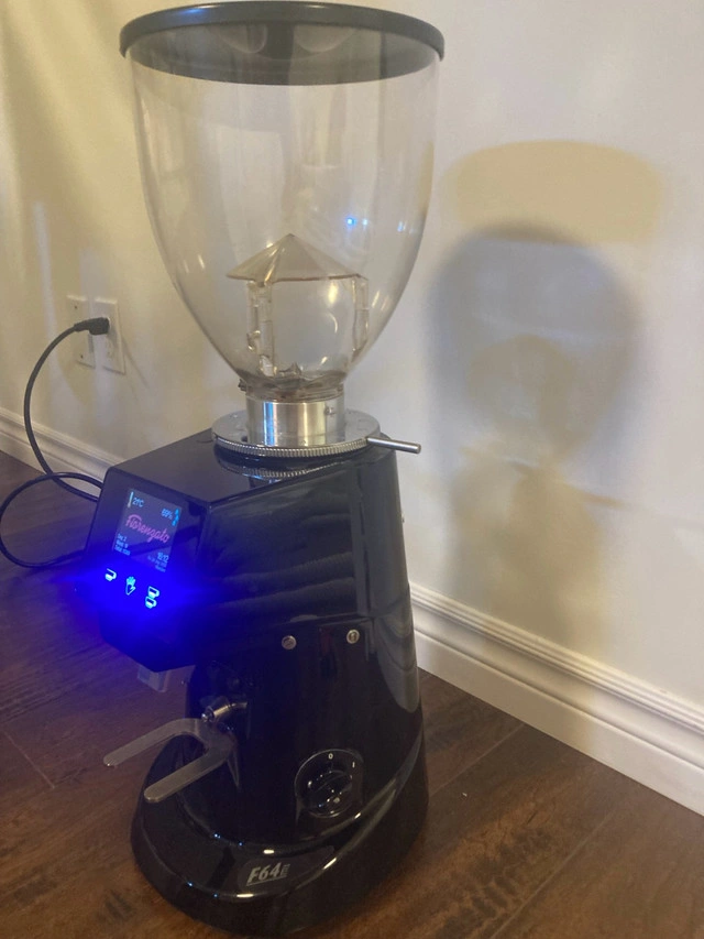 Fiorenzato F64E coffee grinder, perfect for espresso enthusiasts looking for consistent grinds. This model features a digital display, stepless grind adjustment, and 64mm flat burrs for fast and precise coffee grinding. Key features include: * 64mm flat burrs * Digital display with shot timer * Stepless micrometric grind adjustment * Doserless operation * Black finish It's in perfect working condition.