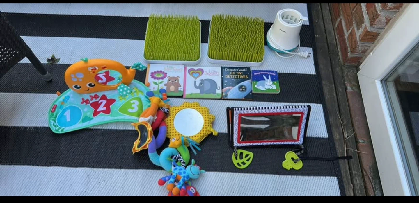 Looking to sell a VTech Sit-to-Stand Learning Walker! It's in great condition and ready for a new home. Perfect for little ones learning to walk and explore. It has lots of fun activities to keep them entertained and help them develop their motor skills Infant toys - mobile for car seat or scroller - black and white contast toy with mirror a interactive whale that sings and lights up Board books 2 drying racks for bottles
