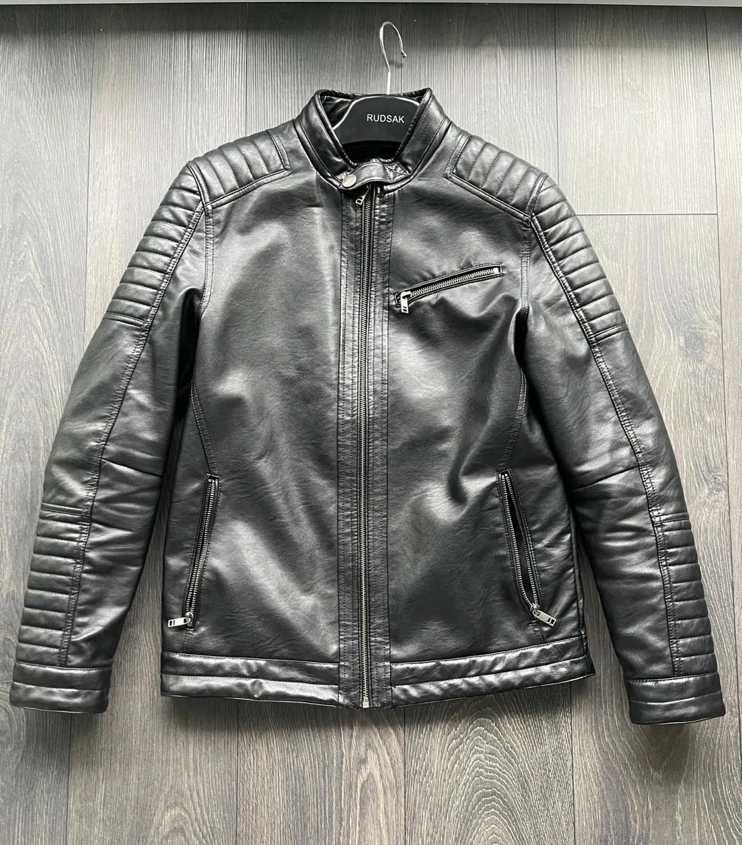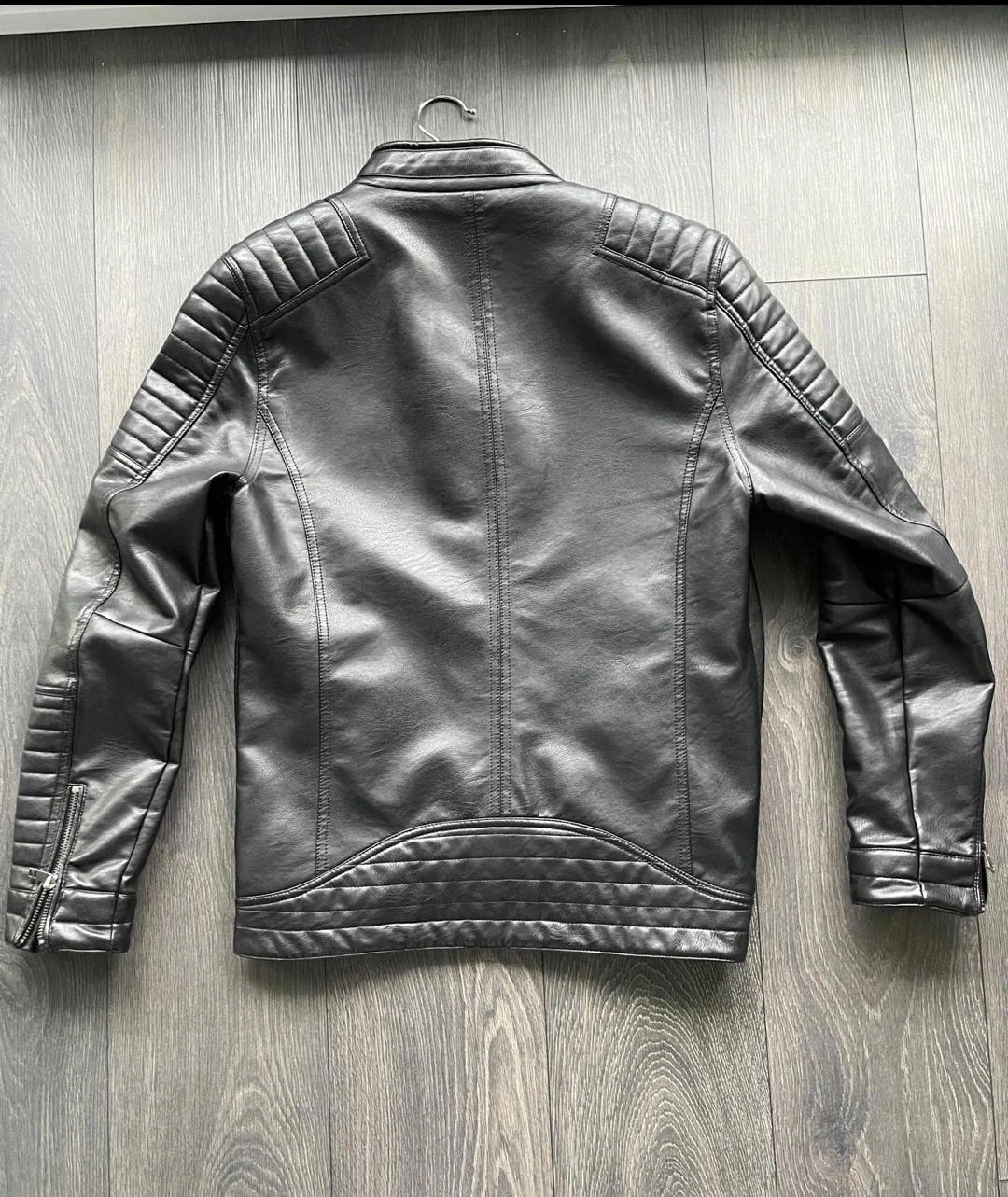 Selling a black leather jacket. It's in great condition and ready for a new home! The jacket features a stylish design with ribbed detailing on the shoulders and sleeves, and a sleek, modern look. Perfect for adding a touch of edge to any outfit!