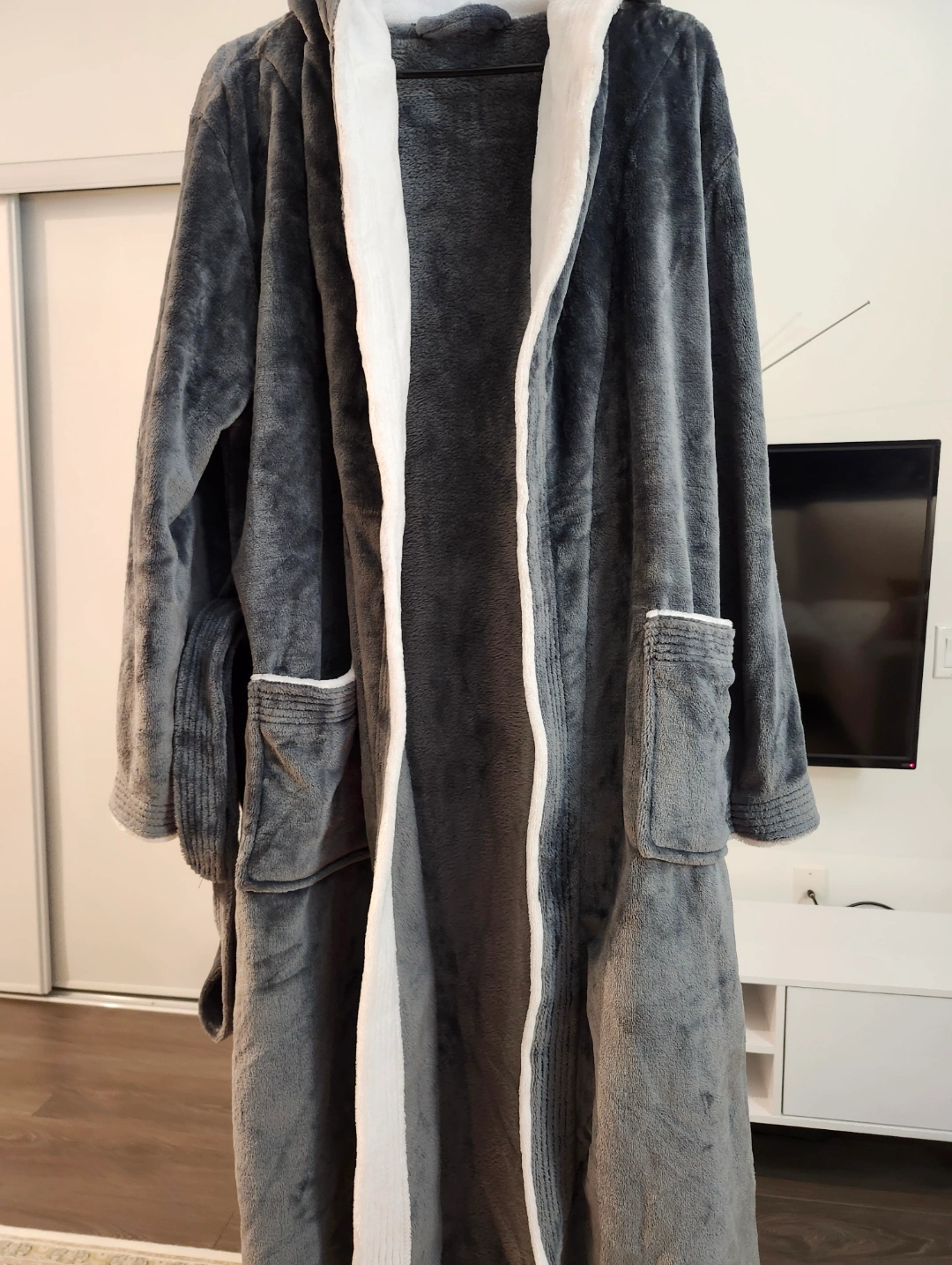 Selling a super comfy grey plush robe! It's in great condition and perfect for cozy nights in. It's got a hood and pockets too! Perfect condition