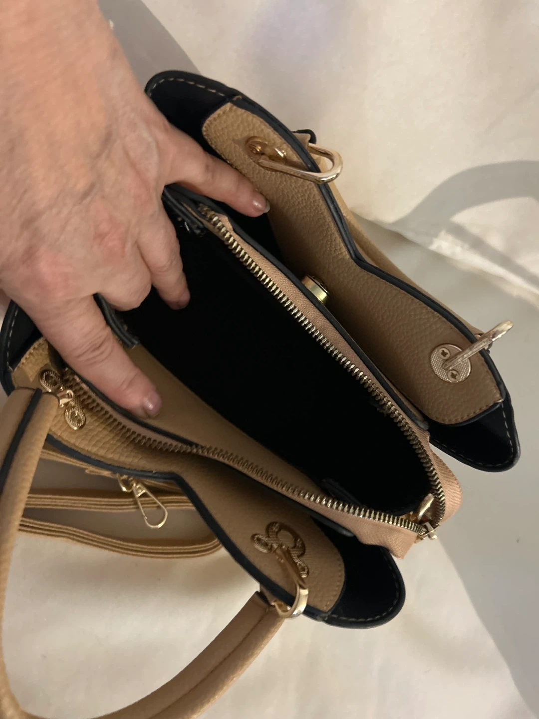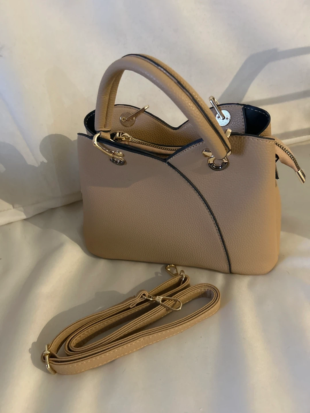 A stylish beige handbag is up for grabs! It features a convenient shoulder strap for easy carrying. The bag has a zipper closure and a lined interior, perfect for keeping your belongings secure and organized