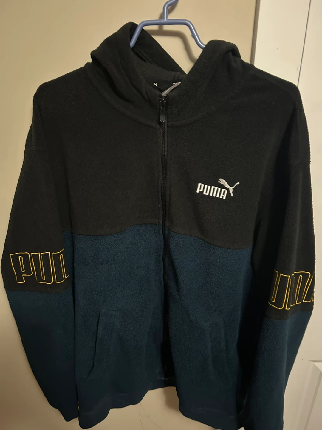 Cozy Puma fleece hoodie in a stylish black and blue colour block design! Features the Puma logo on the chest and sleeve. Perfect for staying warm and looking good