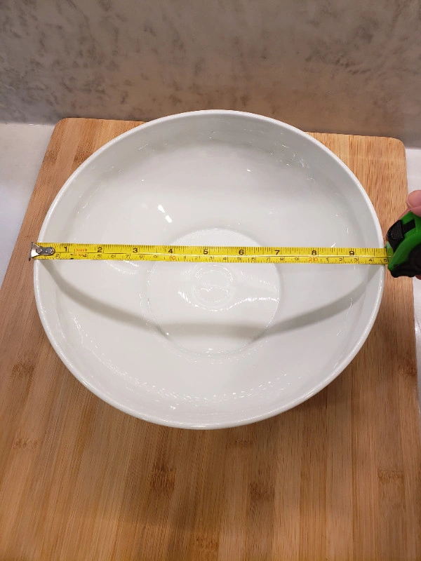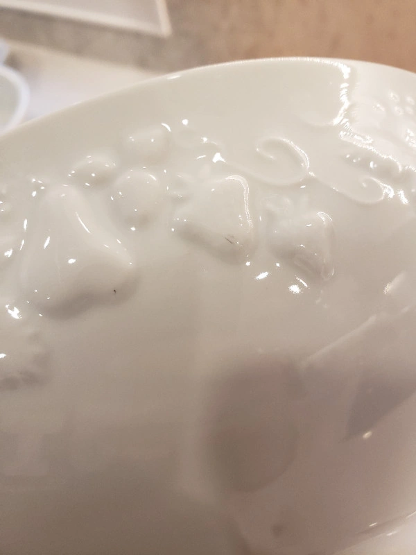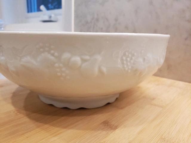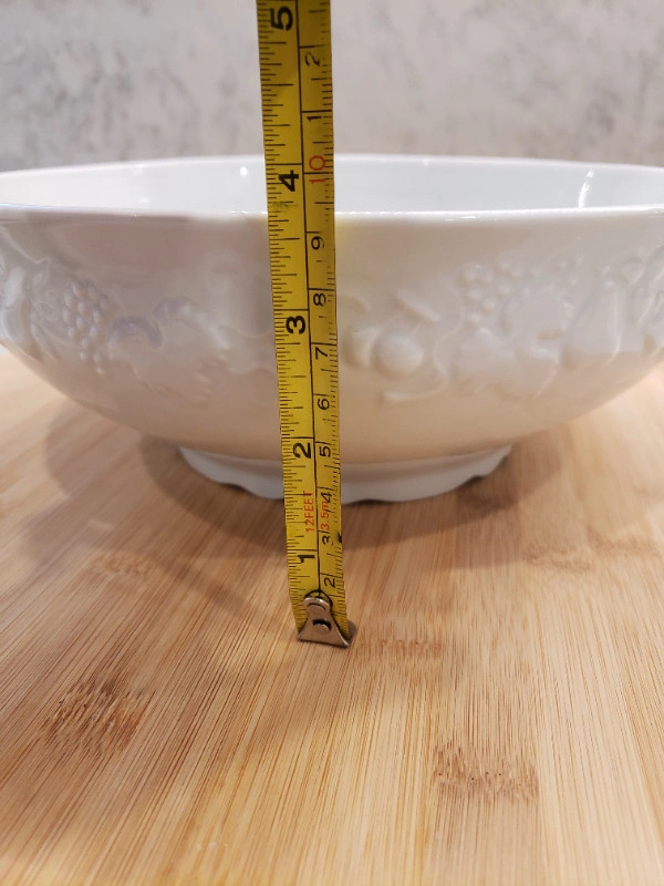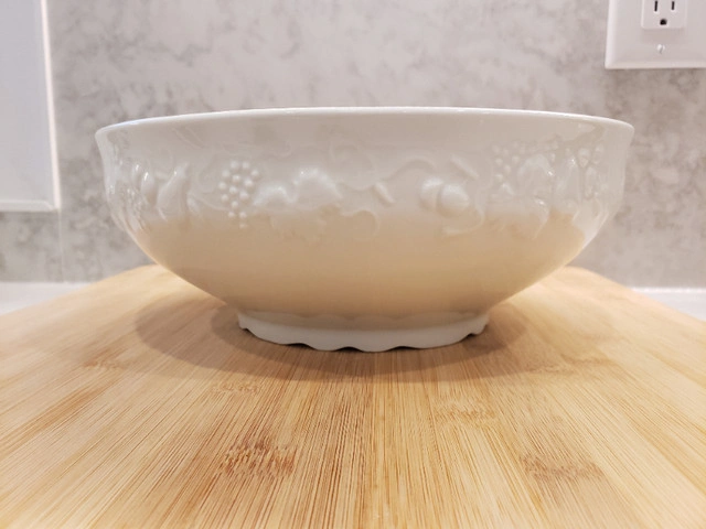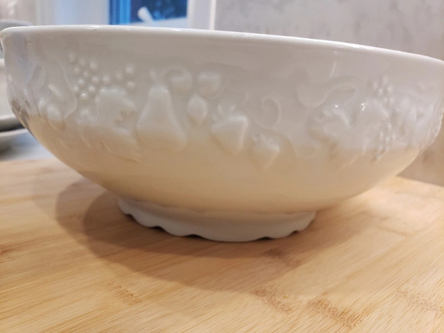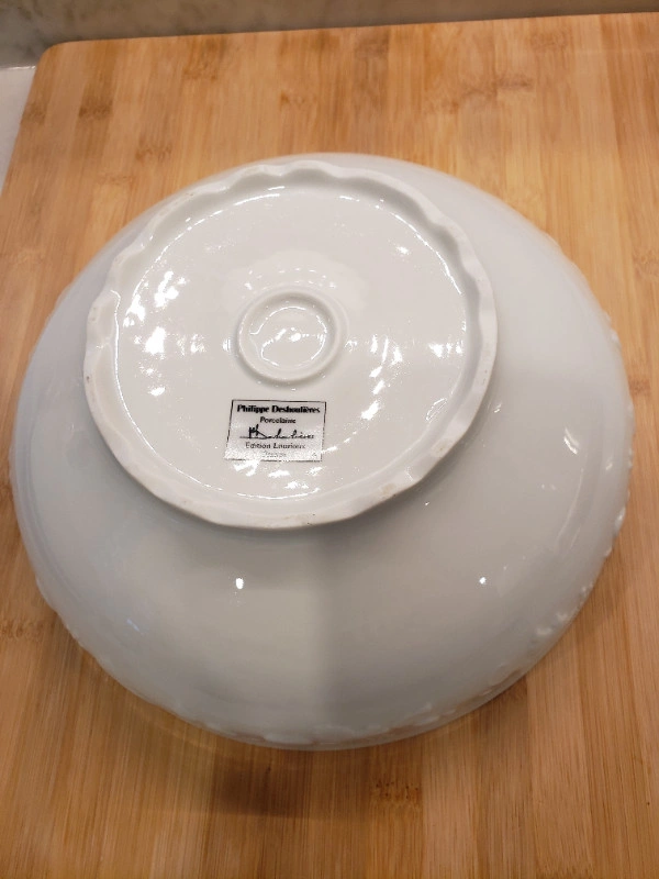 Philippe Deshoulieres Porcelaine Edition Lourioux France White Serving Bowl decorated with fruit, 9.75 inches wide, 3.75 inches tall.