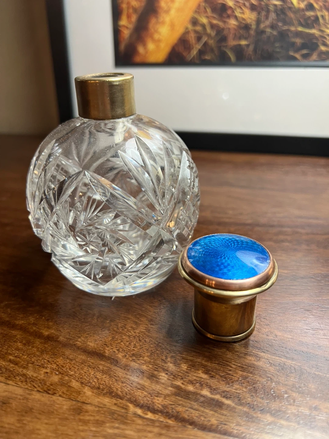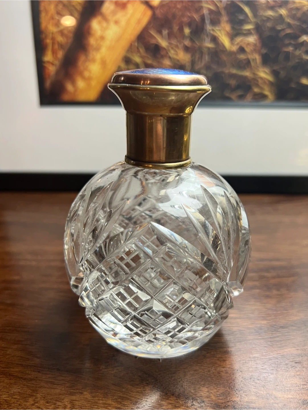 Beautiful round shape Pinwheel and diamond cut facets Blue guilloche enamel over brass fitting Large size measuring 4.75” tall and 3.5” across the bottom Mint condition Collectible piece!!! Asking $25 Interested? Message me and please check my other listings…