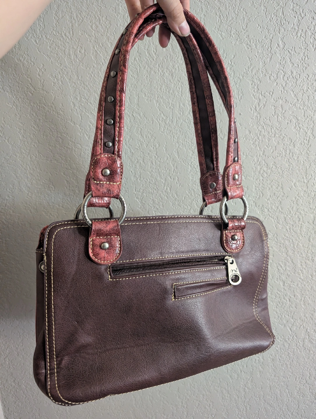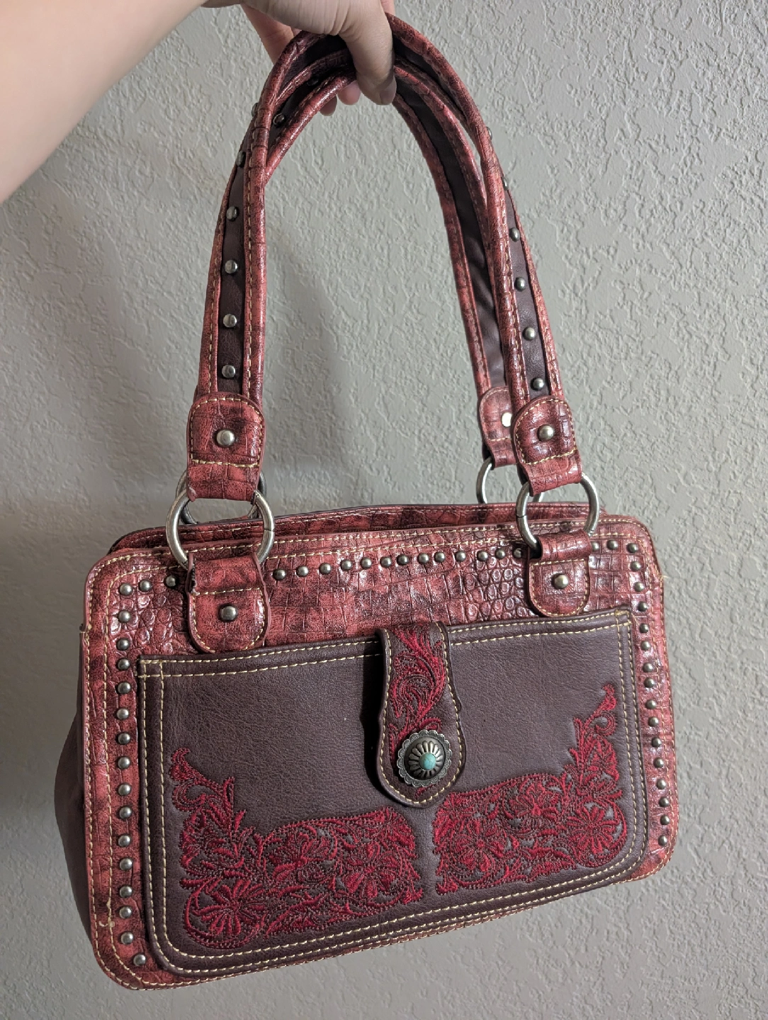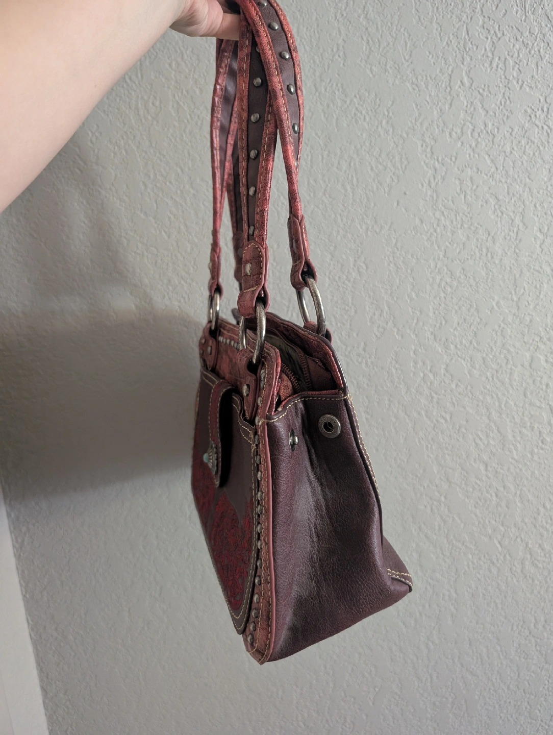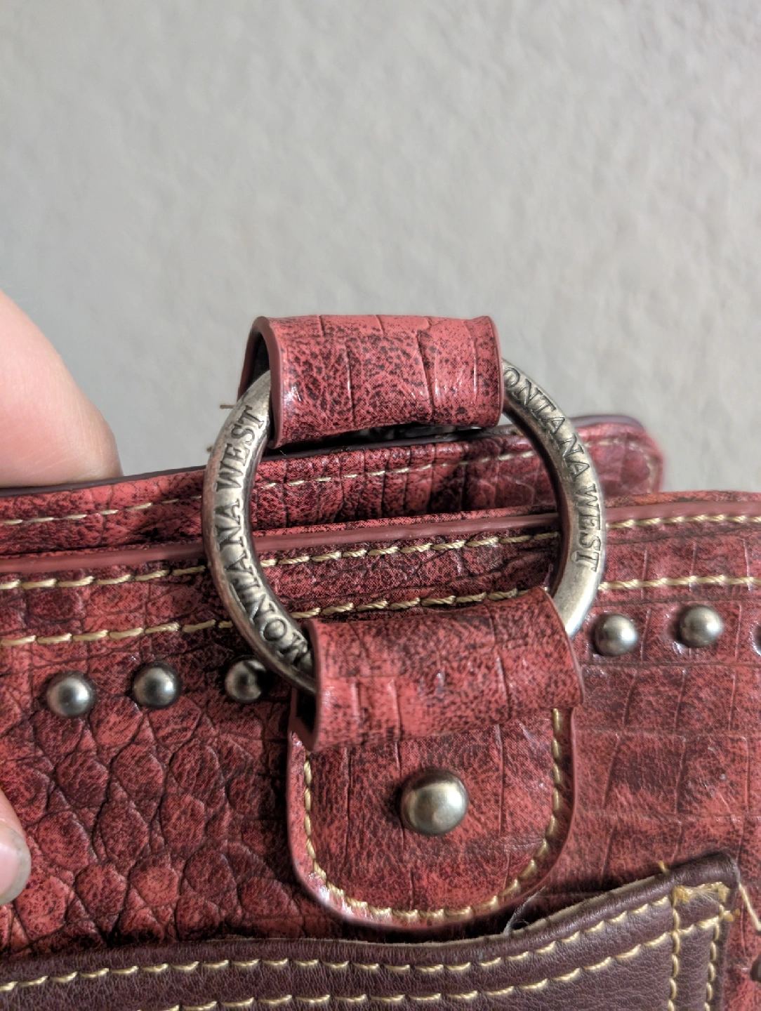 Montana West brown leather purse with red accents and silver hardware. It has a zipper closure and a decorative front flap. The purse is in good condition and has a unique western-inspired design