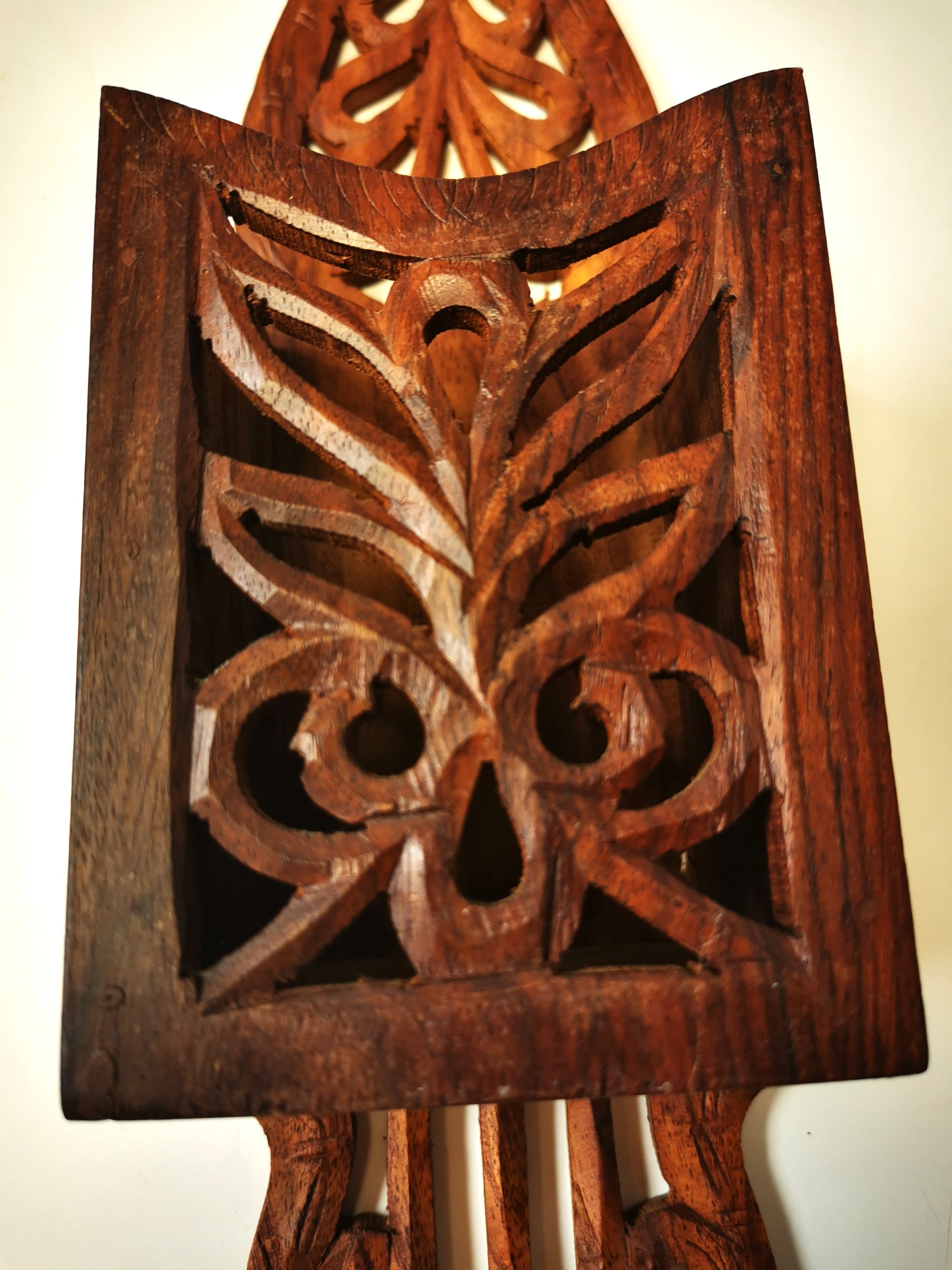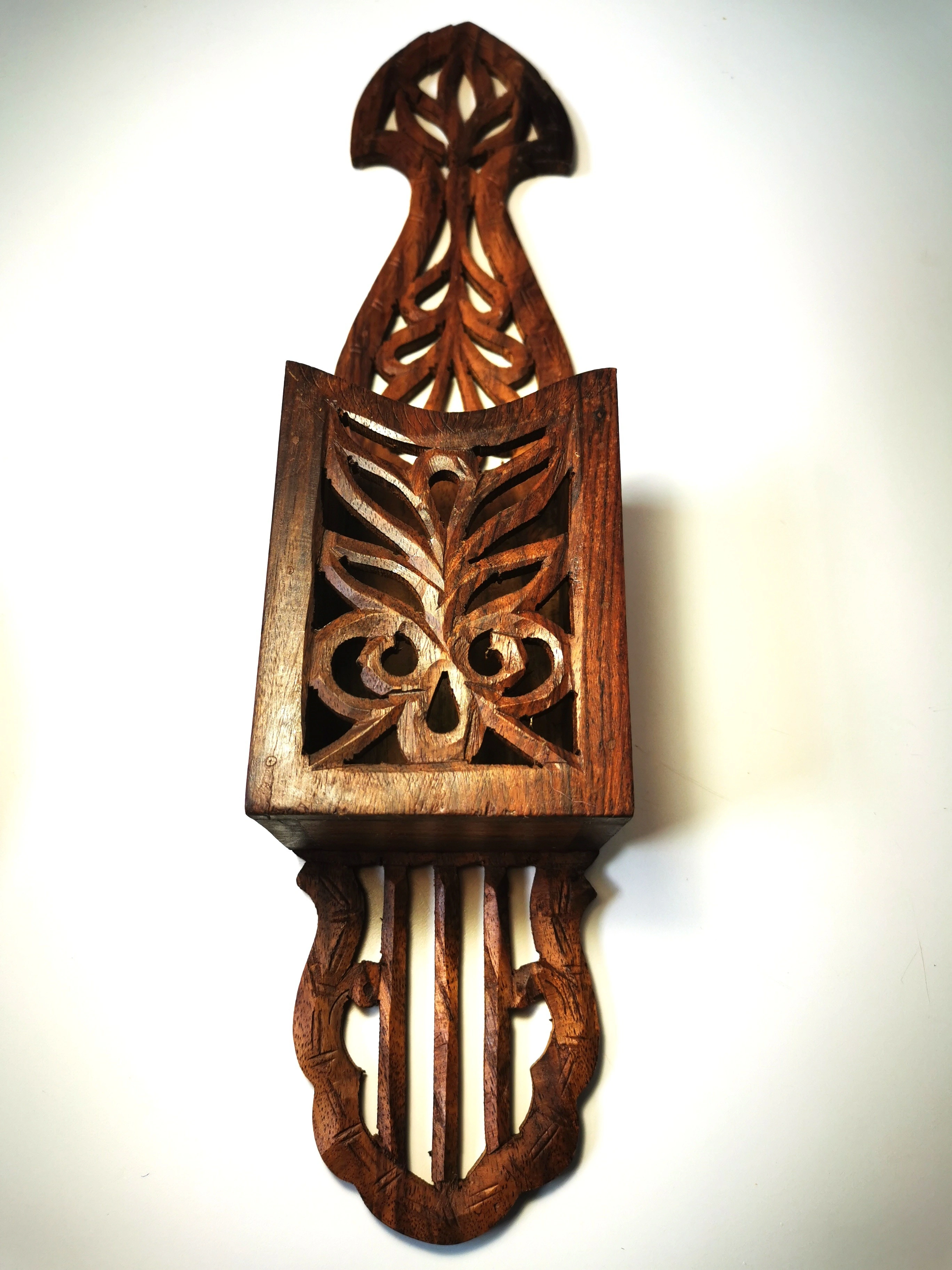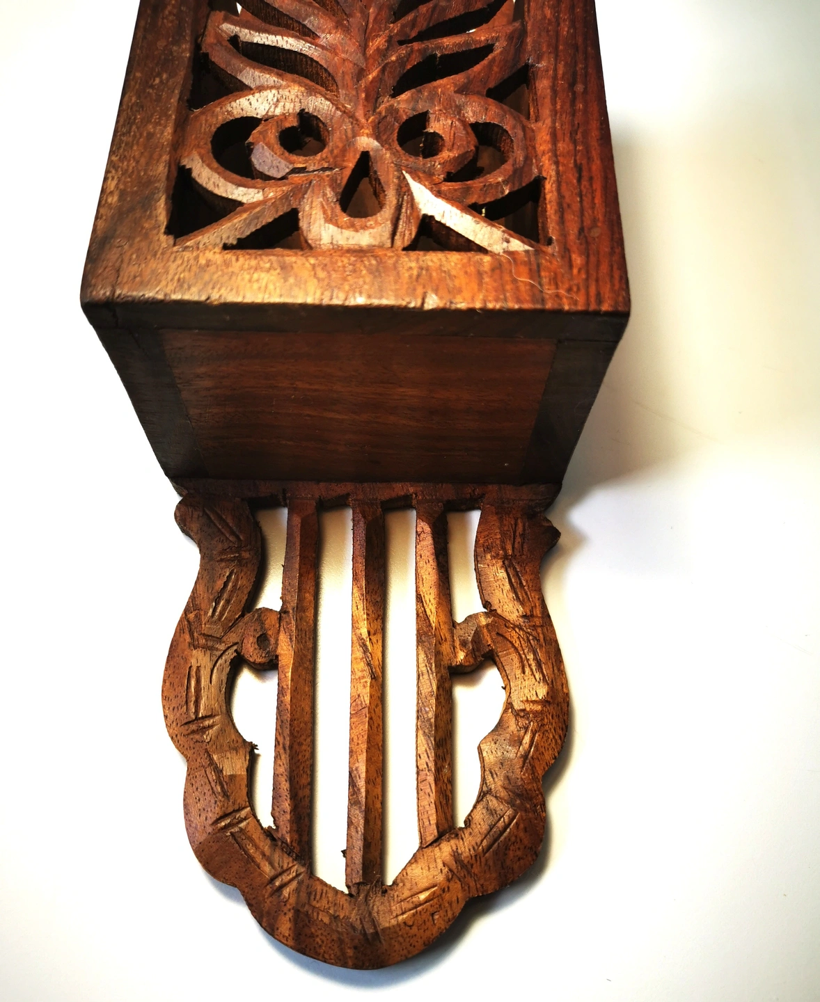 This vintage wall pocket, handmade in India in the 1960s, features a unique all-over pattern and rich brown colour. Made of wood, specifically sheesham, this medium-sized piece is 16 inches long, 2.5 inches tall, and 3.25 inches wide. Perfect for entryways, foyers, kitchens, or dining rooms, this hand-carved wall pocket adds a touch of mid 20th-century charm to any space. Easy to care for, this original piece is a one-of-a-kind decorative collectible that showcases traditional craftsmanship and style. CONDITION: Good vintage condition slight wear on the wood on upper part to be expected with an item from the 1960s, structurally sound. Please reference detailed photos