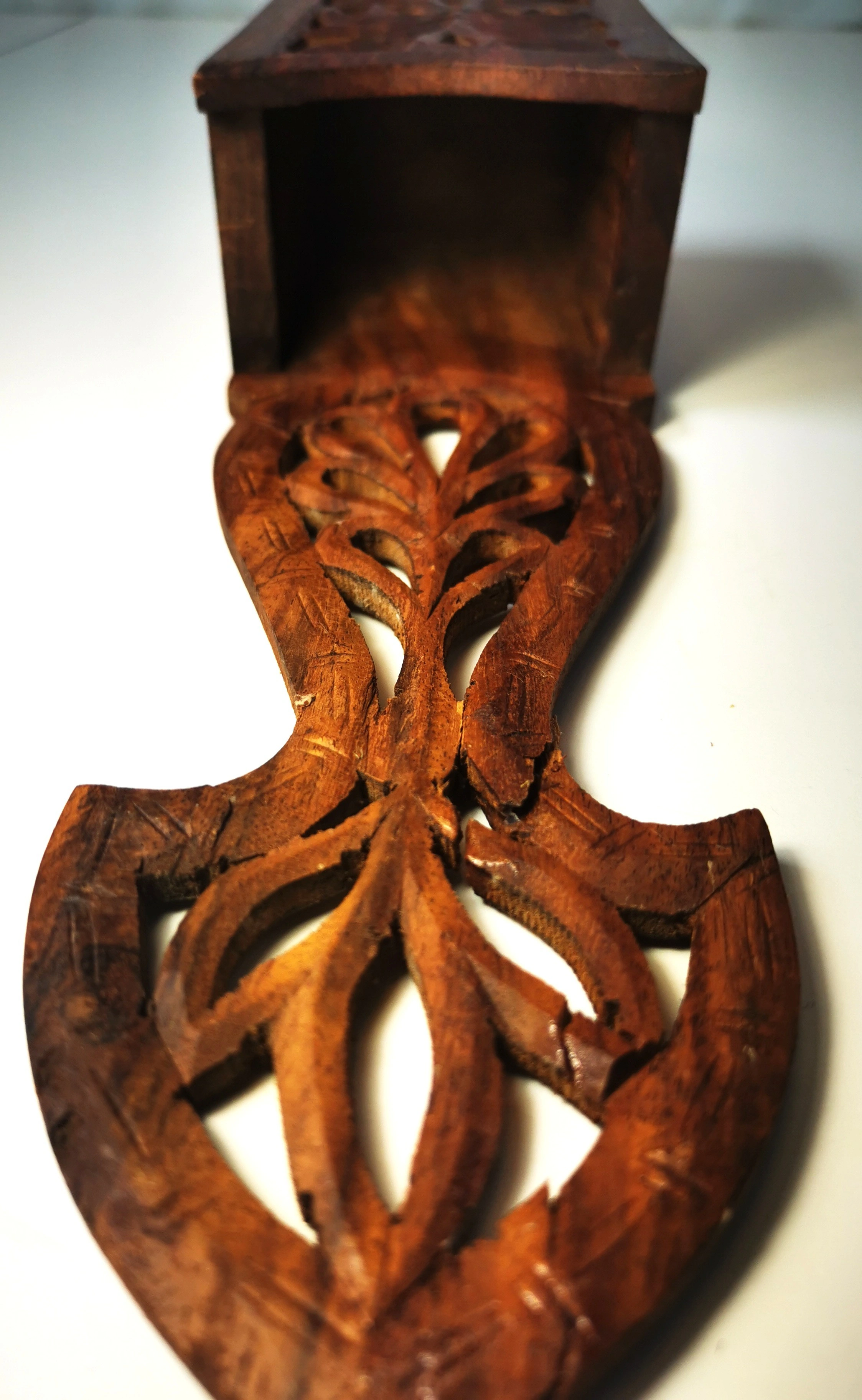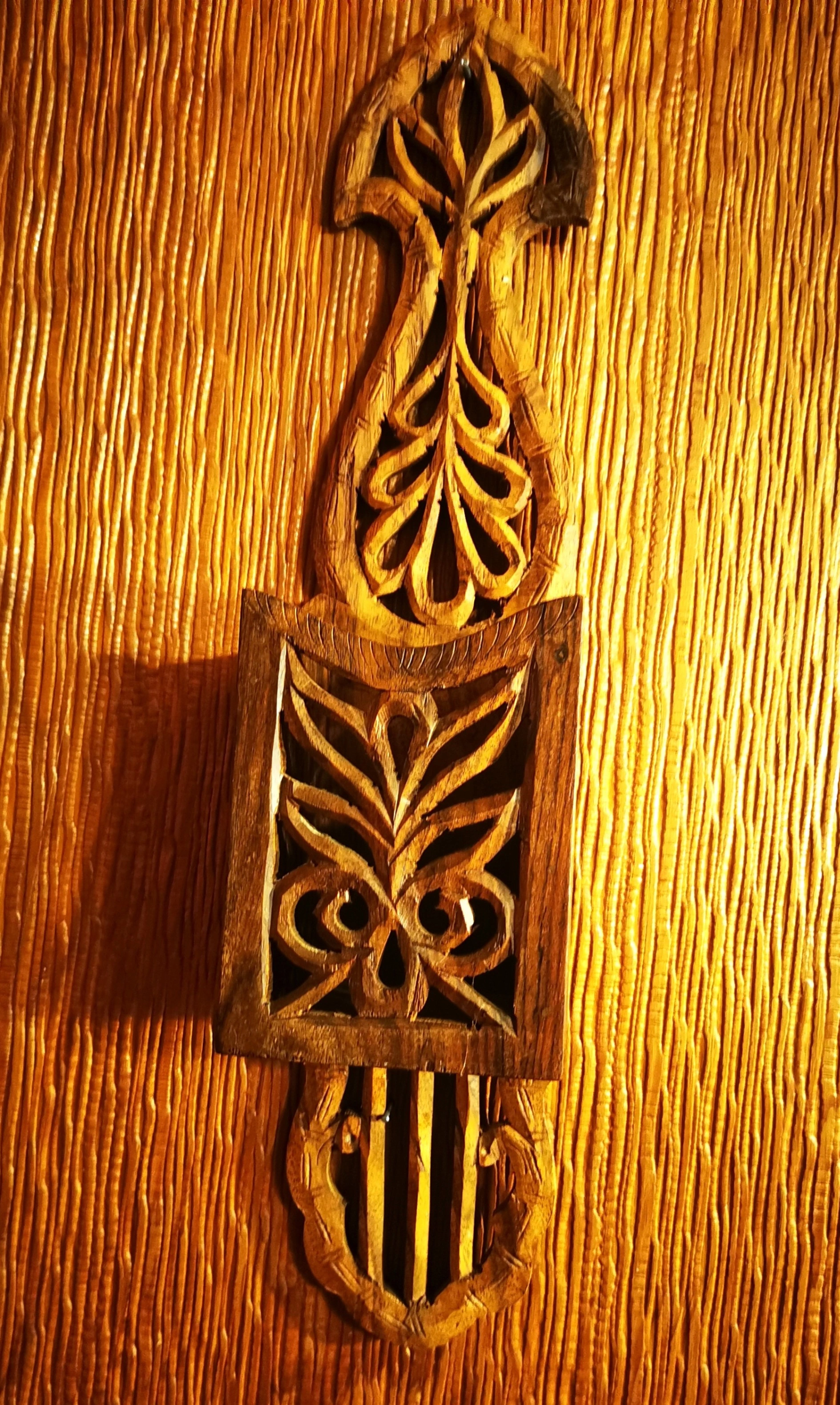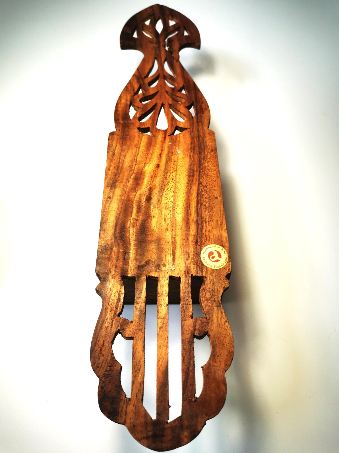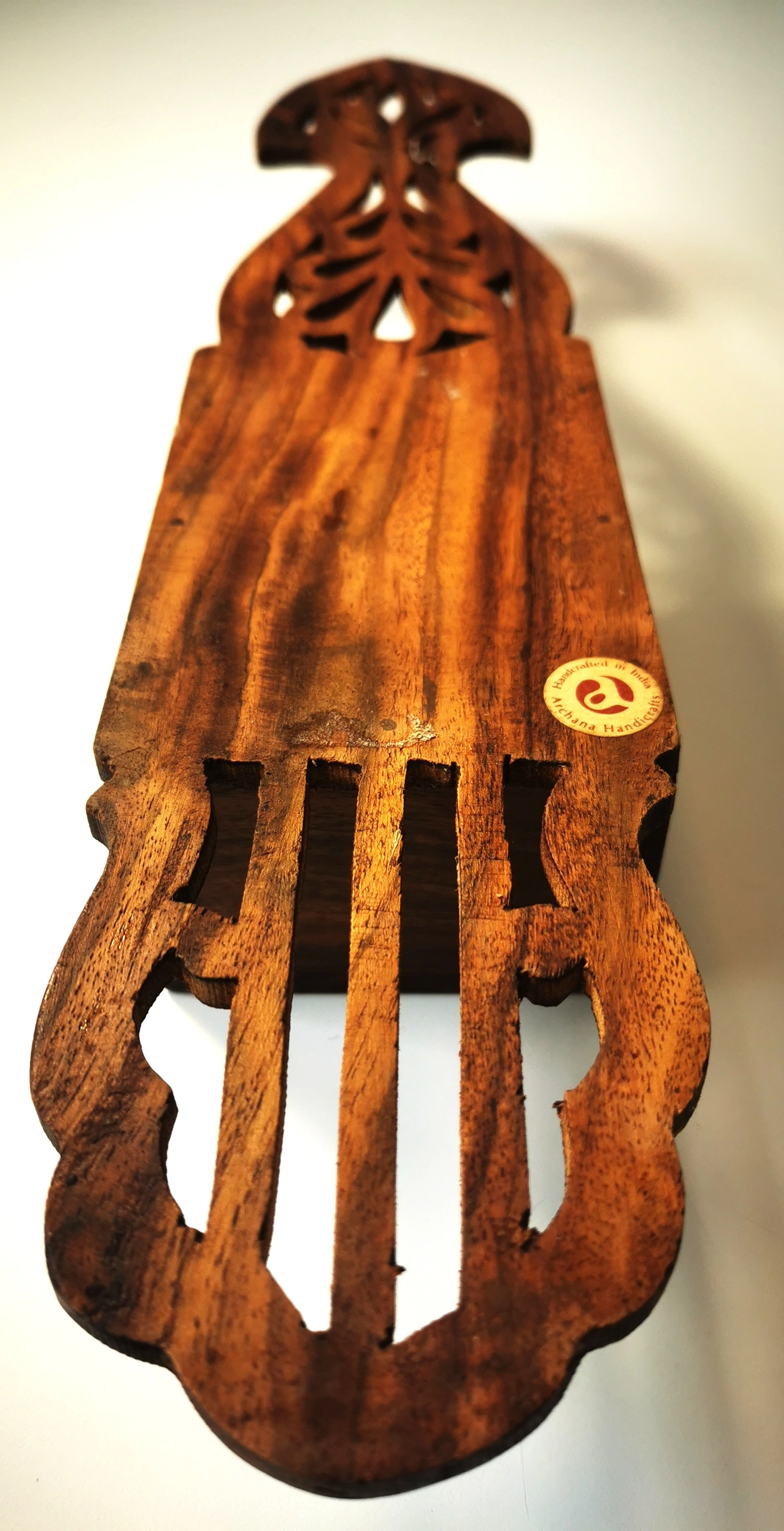 This vintage wall pocket, handmade in India in the 1960s, features a unique all-over pattern and rich brown colour. Made of wood, specifically sheesham, this medium-sized piece is 16 inches long, 2.5 inches tall, and 3.25 inches wide. Perfect for entryways, foyers, kitchens, or dining rooms, this hand-carved wall pocket adds a touch of mid 20th-century charm to any space. Easy to care for, this original piece is a one-of-a-kind decorative collectible that showcases traditional craftsmanship and style. CONDITION: Good vintage condition slight wear on the wood on upper part to be expected with an item from the 1960s, structurally sound. Please reference detailed photos