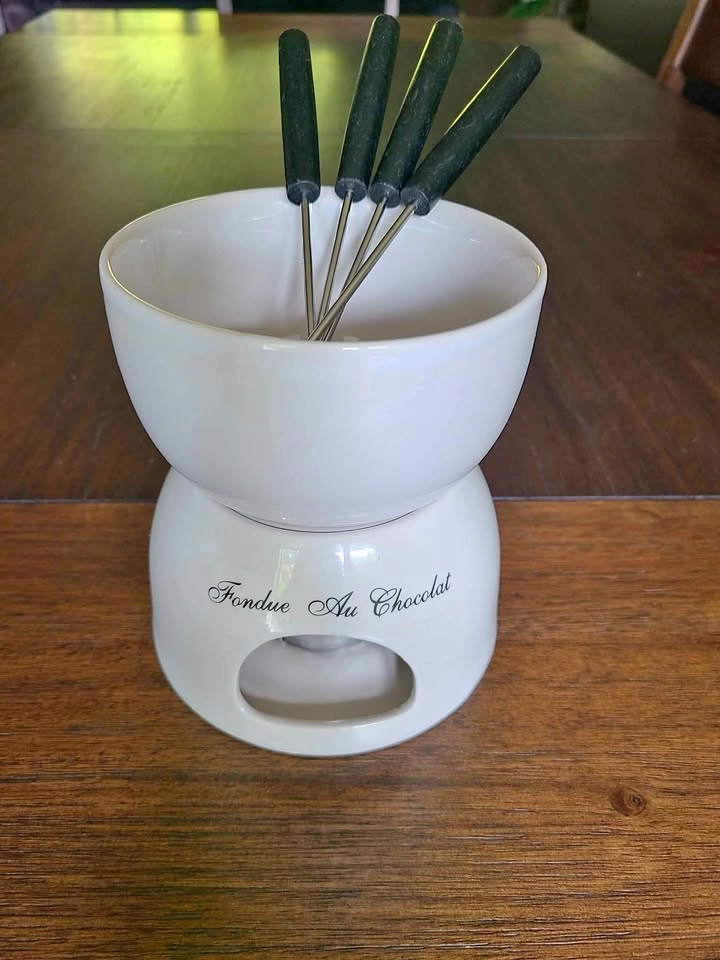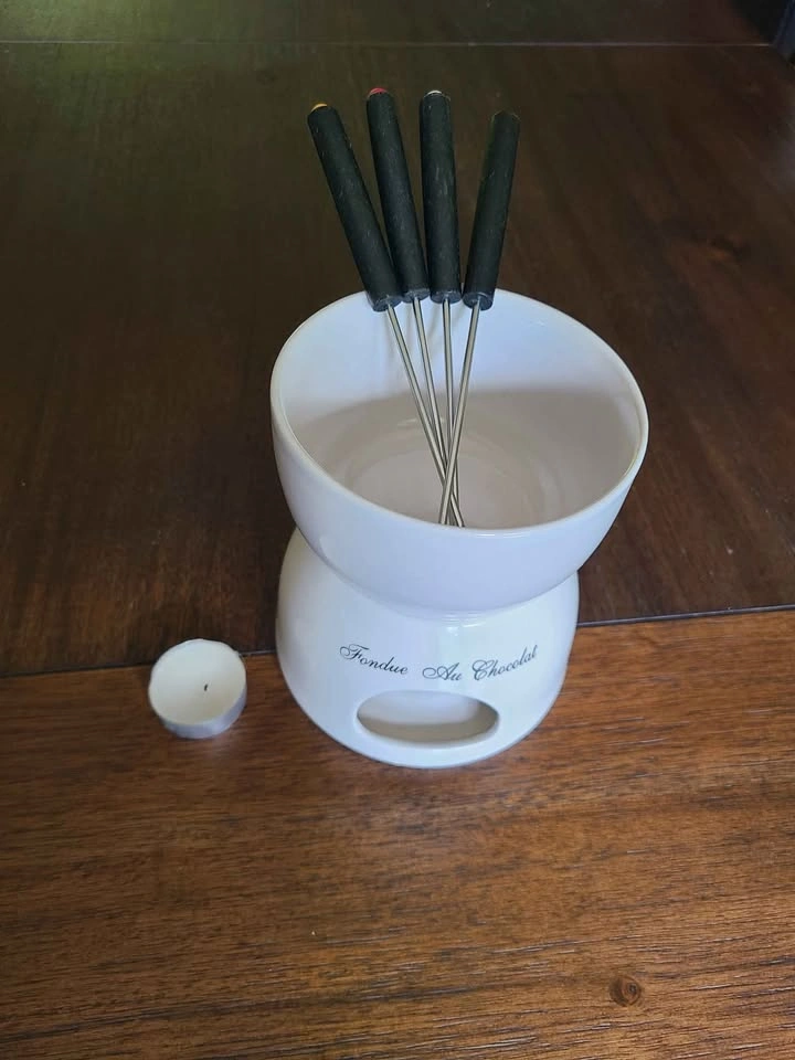 Chocolate Fondue set for fruits. Comes with ceramic pot, tea candle, and 4 stainless steel forks. Pick up near Lou's Grill in Abbotsford.