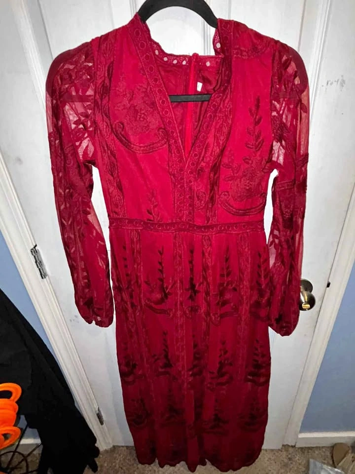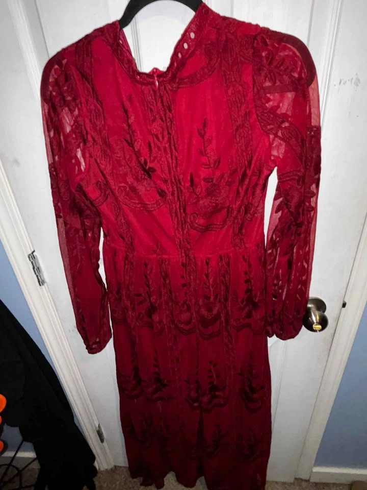 Size Small (S) Gorgeous red lace maxi dress with intricate floral embroidery Sheer long sleeves with elegant details 🌹 Deep V-neckline with a flattering waistline Fully lined with sheer lace overlay – perfect for parties, weddings, or special occasions Condition: Like New – very beautiful piece 💖 $28 Pickup in Mission Don’t forget to check my other listings for more fashion deals at #TinyPriceMission