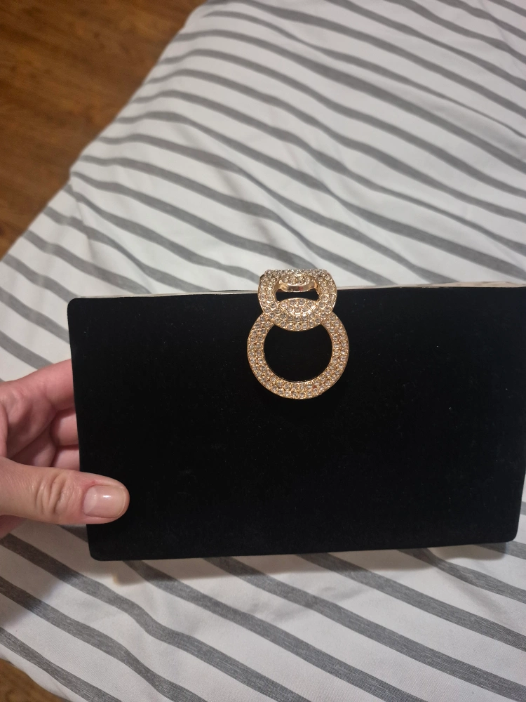 Selling a cute black velvet clutch! It features a gold-tone clasp with rhinestones, adding a touch of sparkle. The clutch also comes with a gold chain strap, perfect for carrying it on your shoulder if you prefer