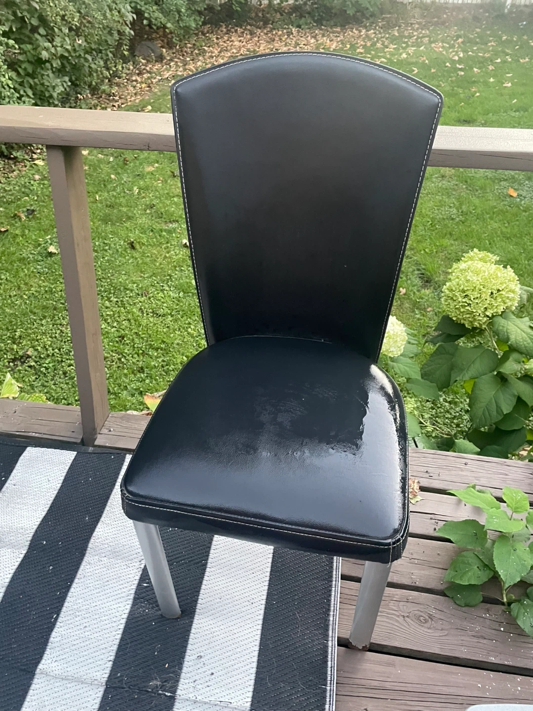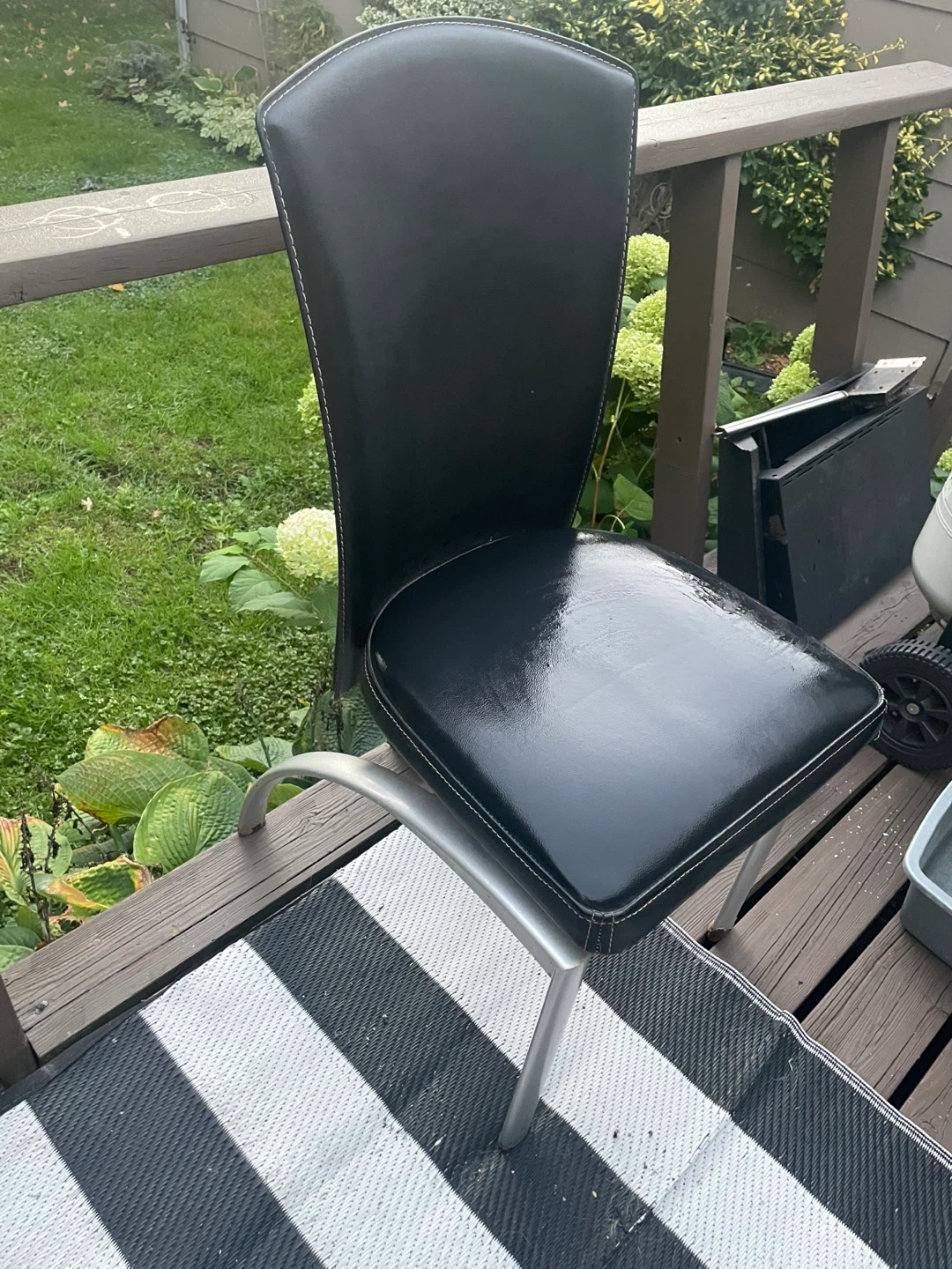 6 Black Dining Chairs - $10 each/6 for $50. They’re in great condition and would be perfect for any dining room or kitchen. The chair is a sleek black colour with silver legs.