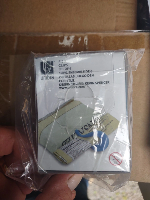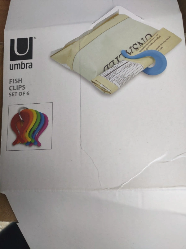 Umbra Fish clips for sale in new unopened condition. They are great for keeping chip bags pasta bags bread bags and many other types of bags closed. The fish clips come in a package of 6. Asking $5 each obo let me know Thank you