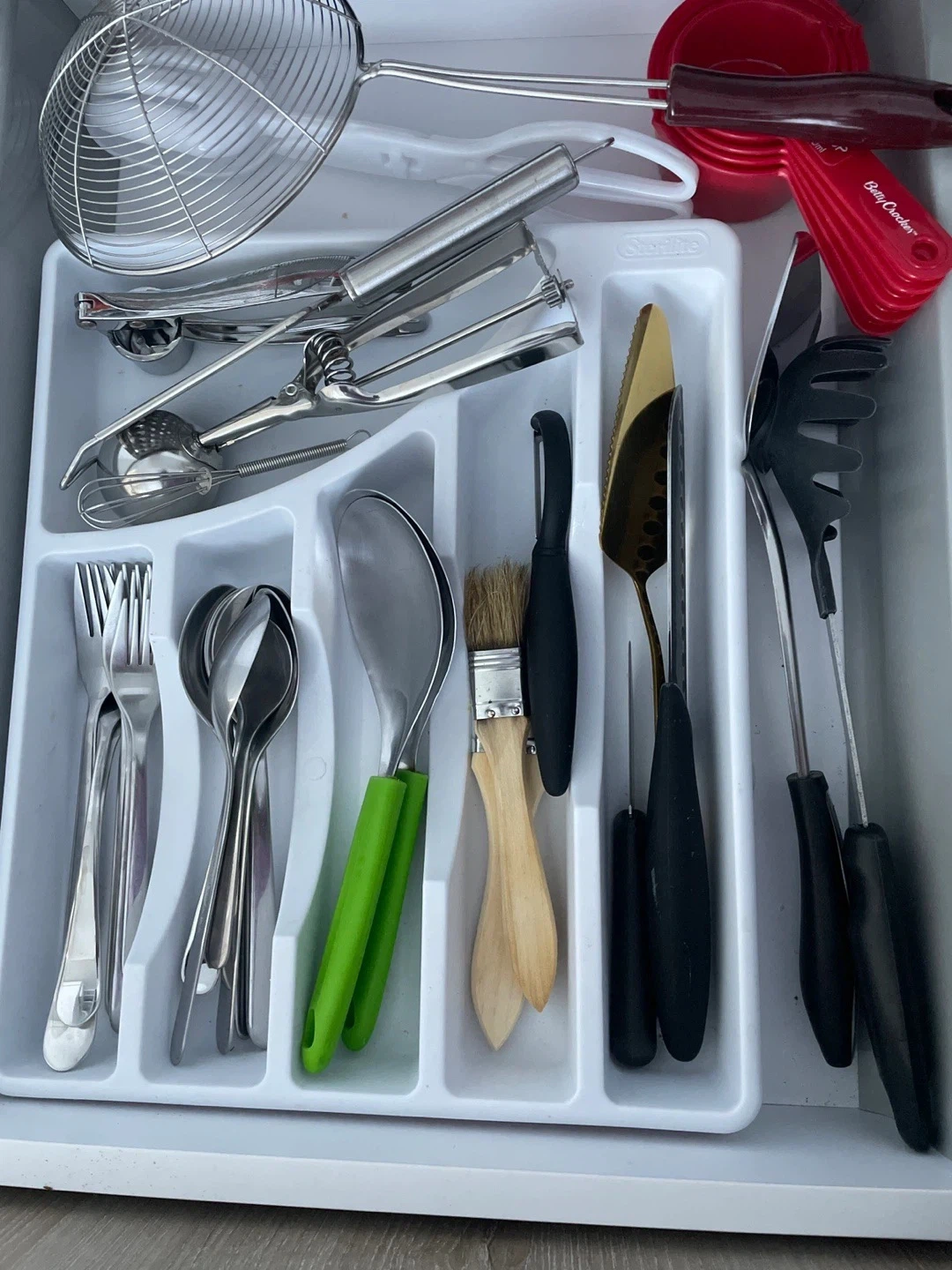 Assorted kitchen utensils including a strainer, ice cream scoop, measuring cups, and various spoons and knives. Great for stocking a new kitchen or replacing worn-out tools!