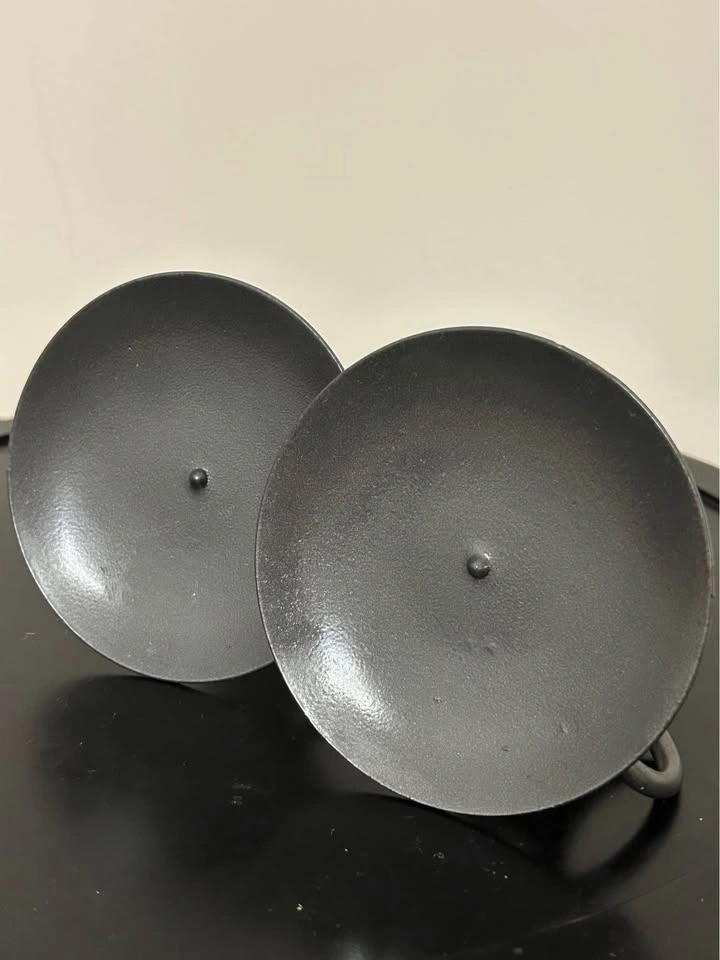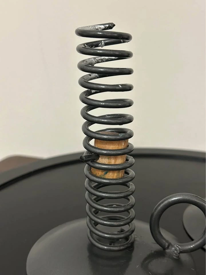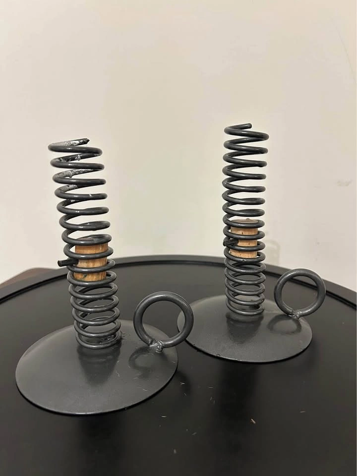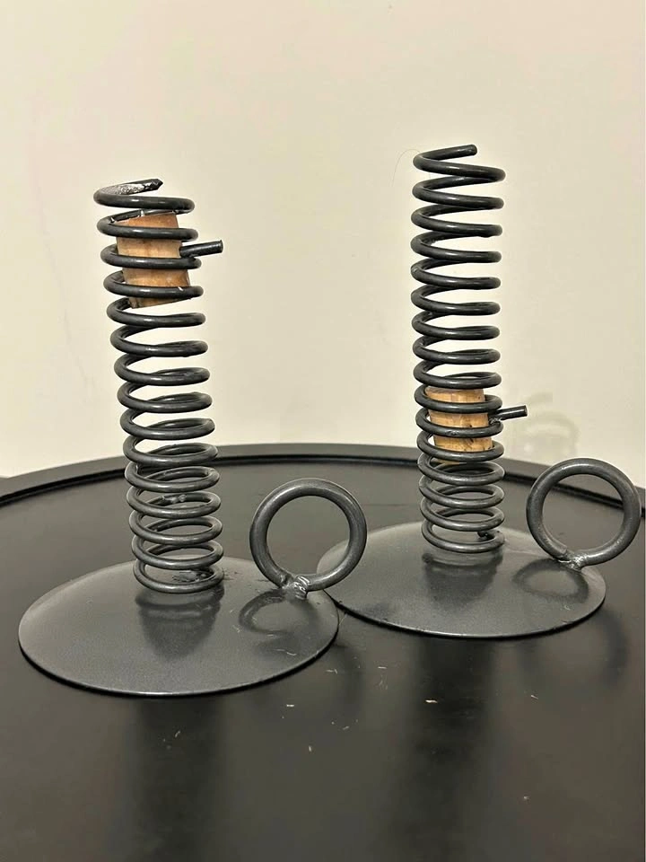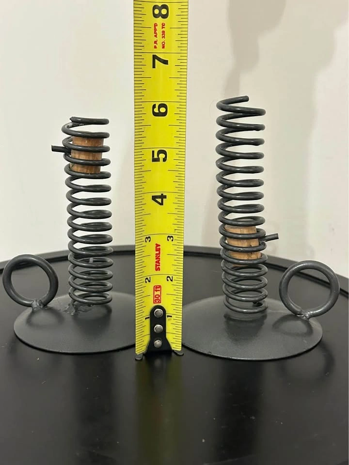 Set of 2 rustic-style metal candle holders with spiral spring design and wooden insert. Each features a circular base with a side ring handle, inspired by antique “push-up” candlesticks. Perfect for farmhouse, primitive, or colonial décor. Great decorative pair for displaying taper candles. Pick up: Seton area, Calgary. See also my other lots. Open to your questions and suggestions. If necessary, I provide additional photos. These are not new things, so please look carefully at the photos and videos. Sizes are submitted on request and also using a tape measure in the photo.