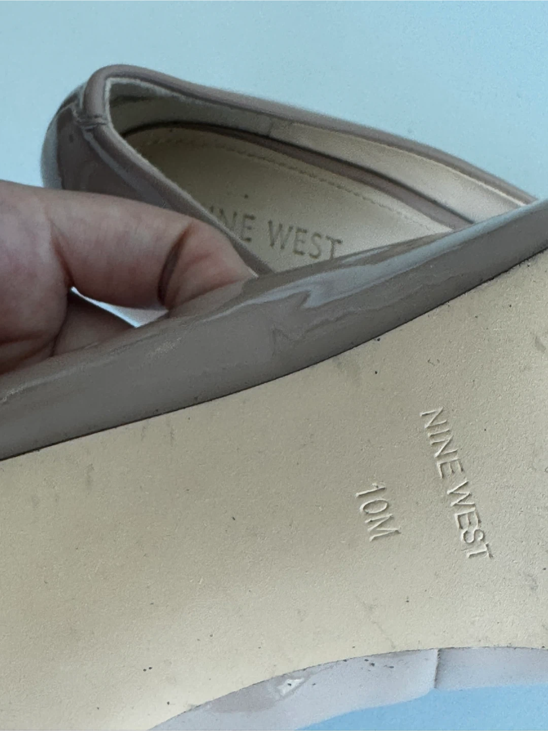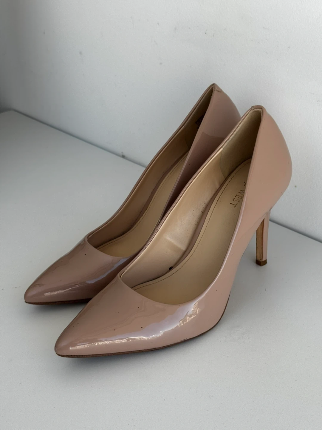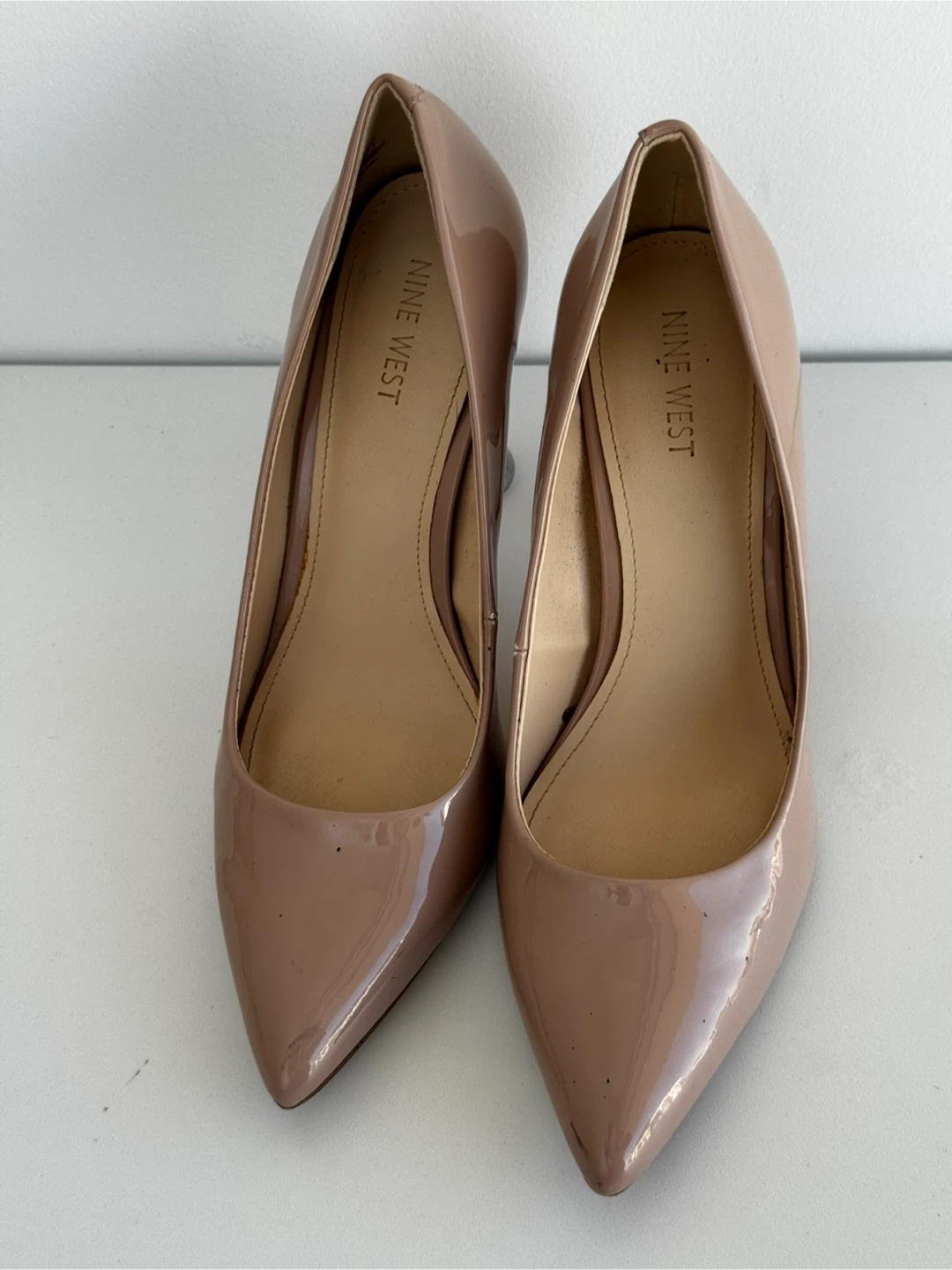 Selling a pair of Nine West heels in a lovely beige patent leather finish! They are a size 10M and are in great condition. Perfect for dressing up or adding a touch of elegance to your outfit!