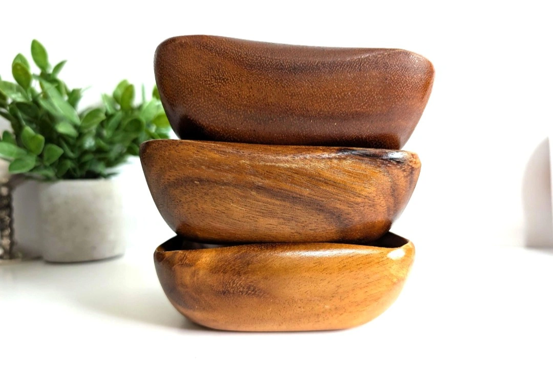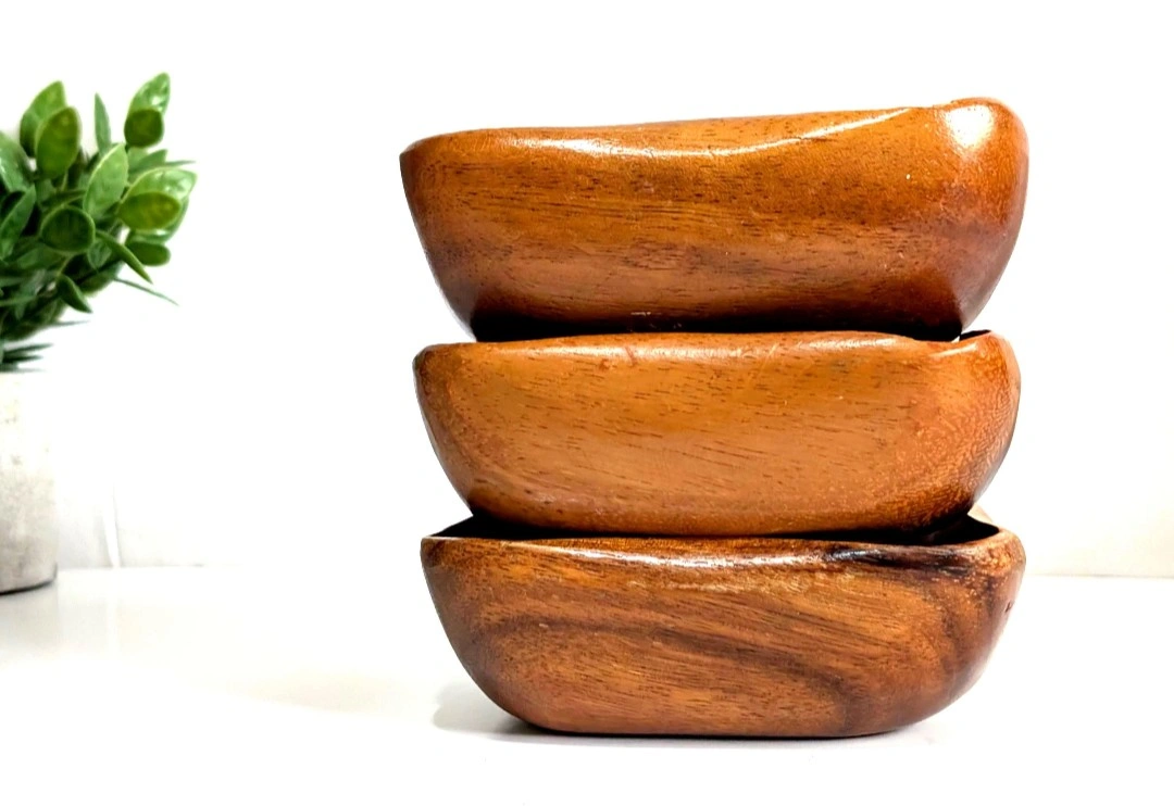 Fabulous retro wooden salad bowls. Set of three. Uniquely carved, square with an inward curve. Each bowl measures approximately 6 inches x 6 inches. Good vintage condition consistent with age. Some minor wear. A light coat of olive oil brings back the shine. Excellent retro bohemian vibe. π PICK UP TOWNLINE HWY 2 AREA π CASH is preferred please π Thanks for looking π©΅