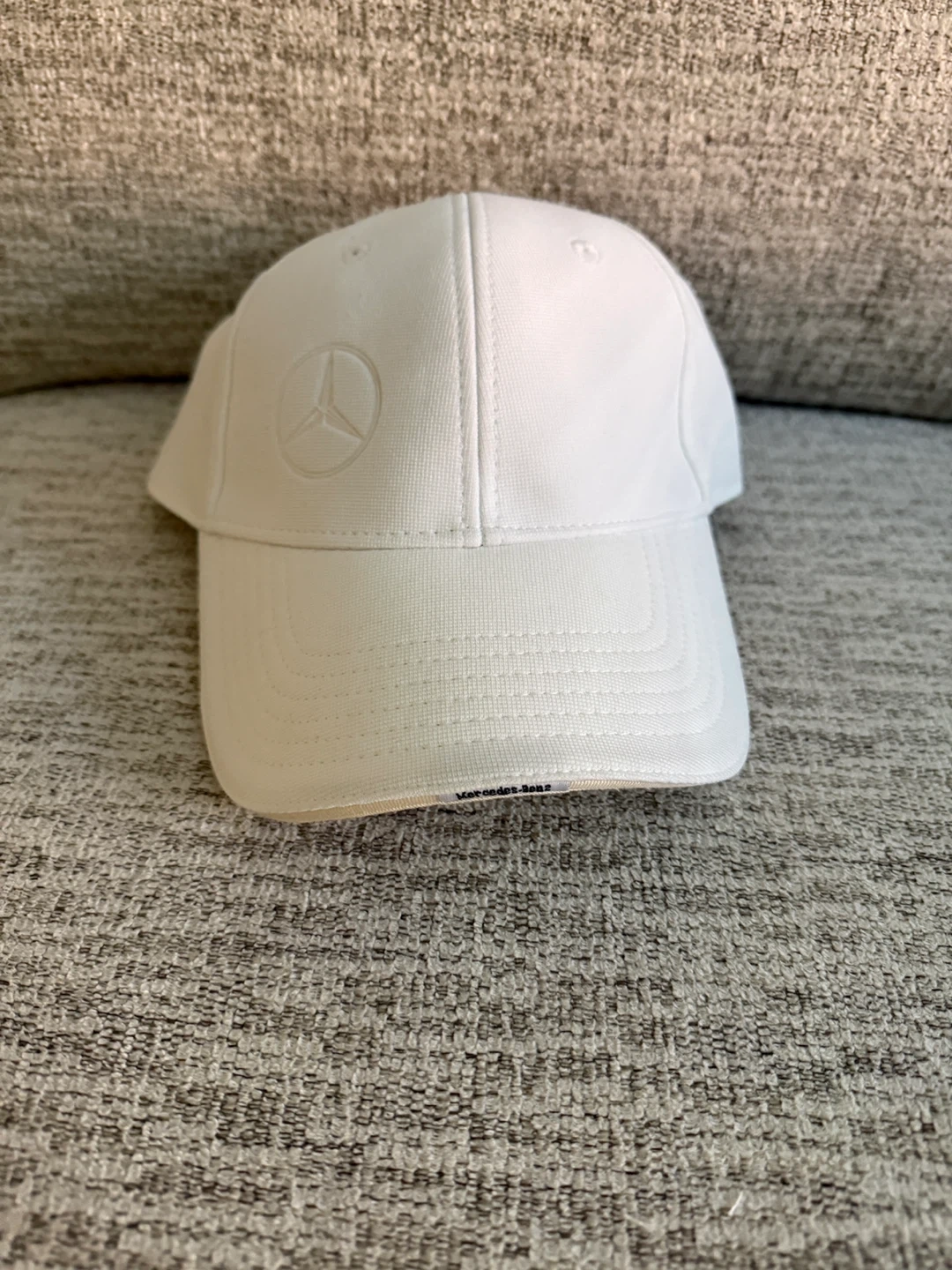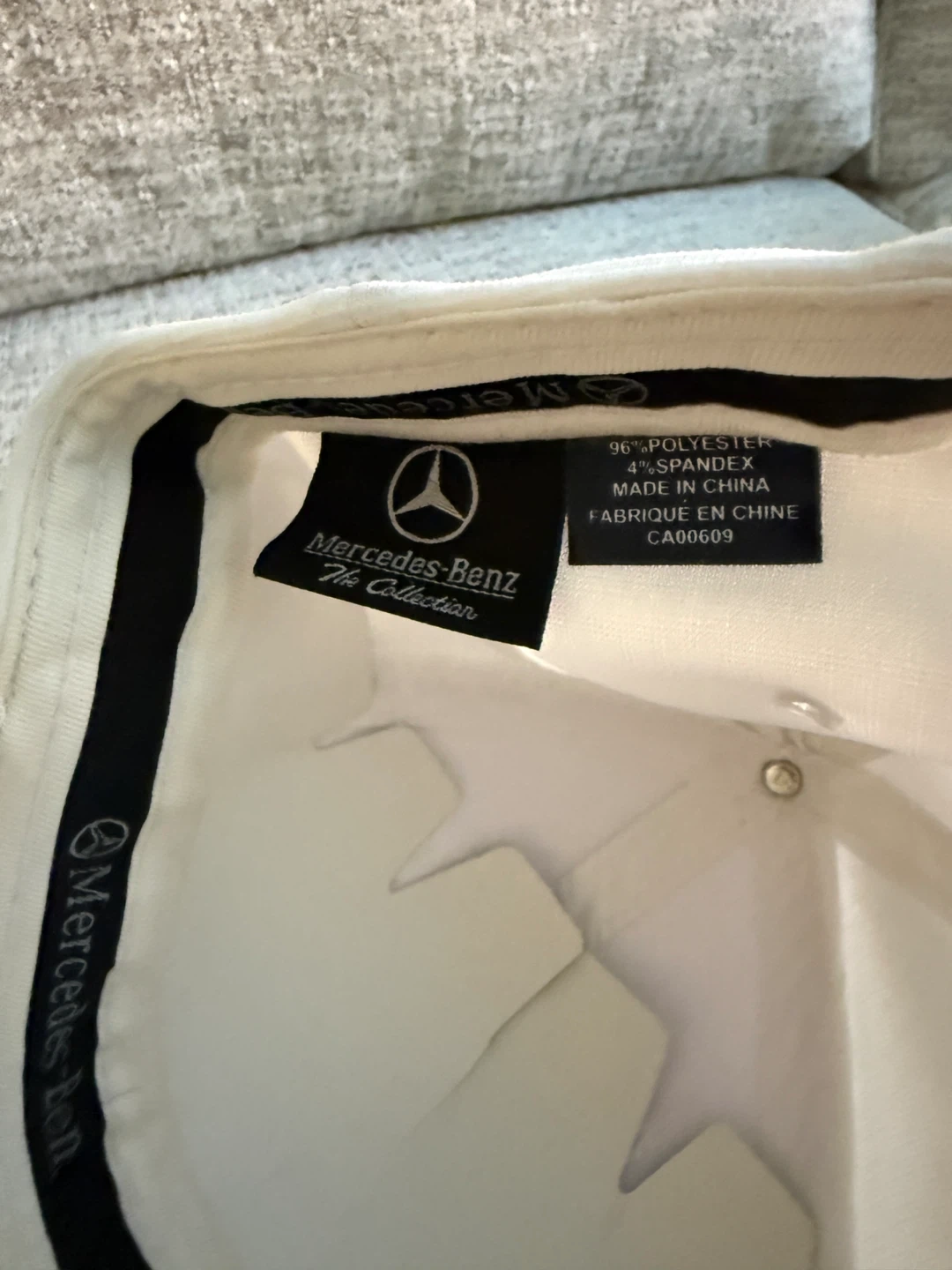 Selling a stylish white baseball cap from Mercedes-Benz's 'The Collection'. It's in great condition and made of 96% polyester and 4% spandex. Perfect for any Mercedes enthusiast!