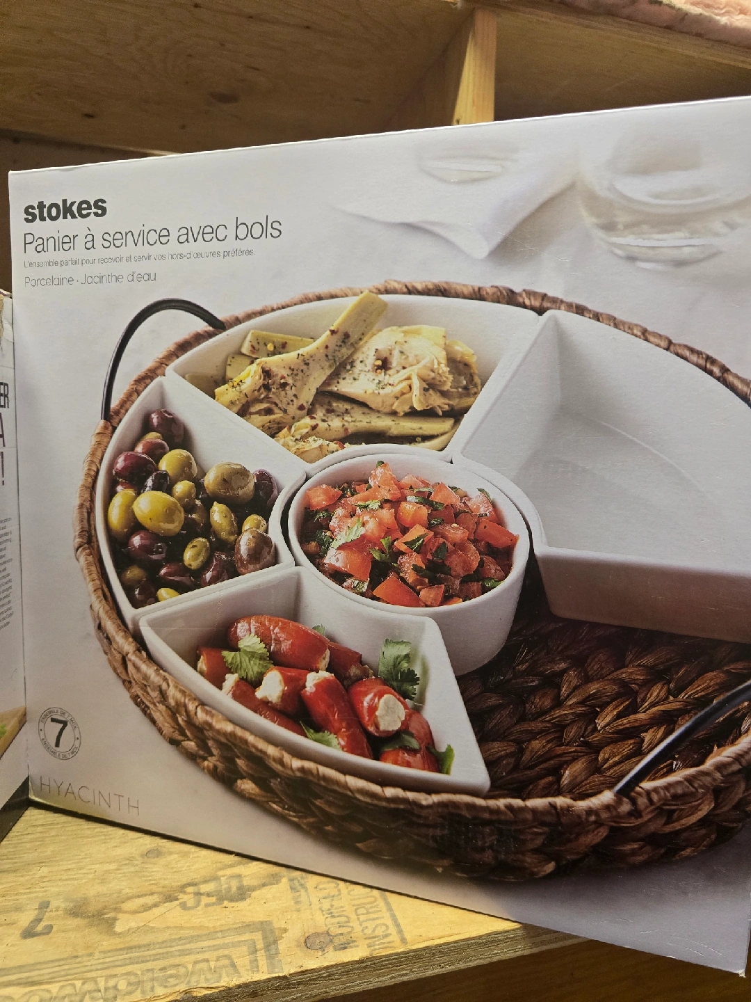 Selling a brand new Stokes serving set with basket! This 7-piece set is perfect for serving appetizers or snacks. The set is made of porcelain and water hyacinth.