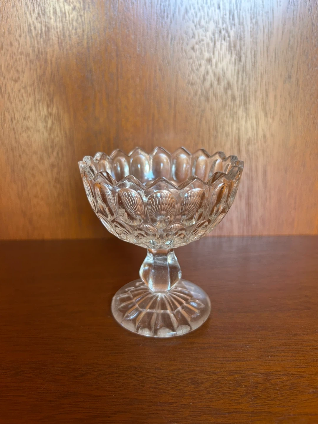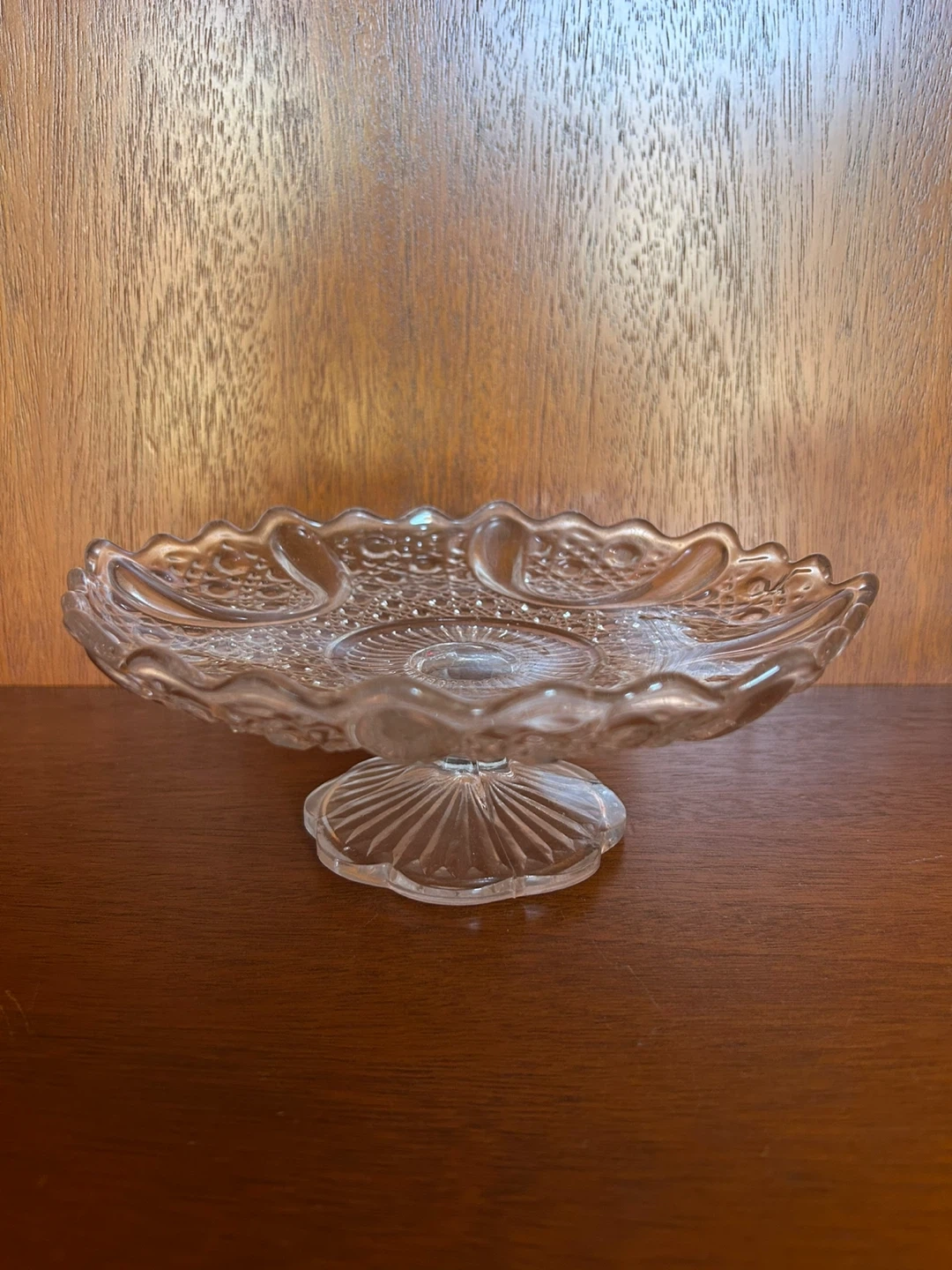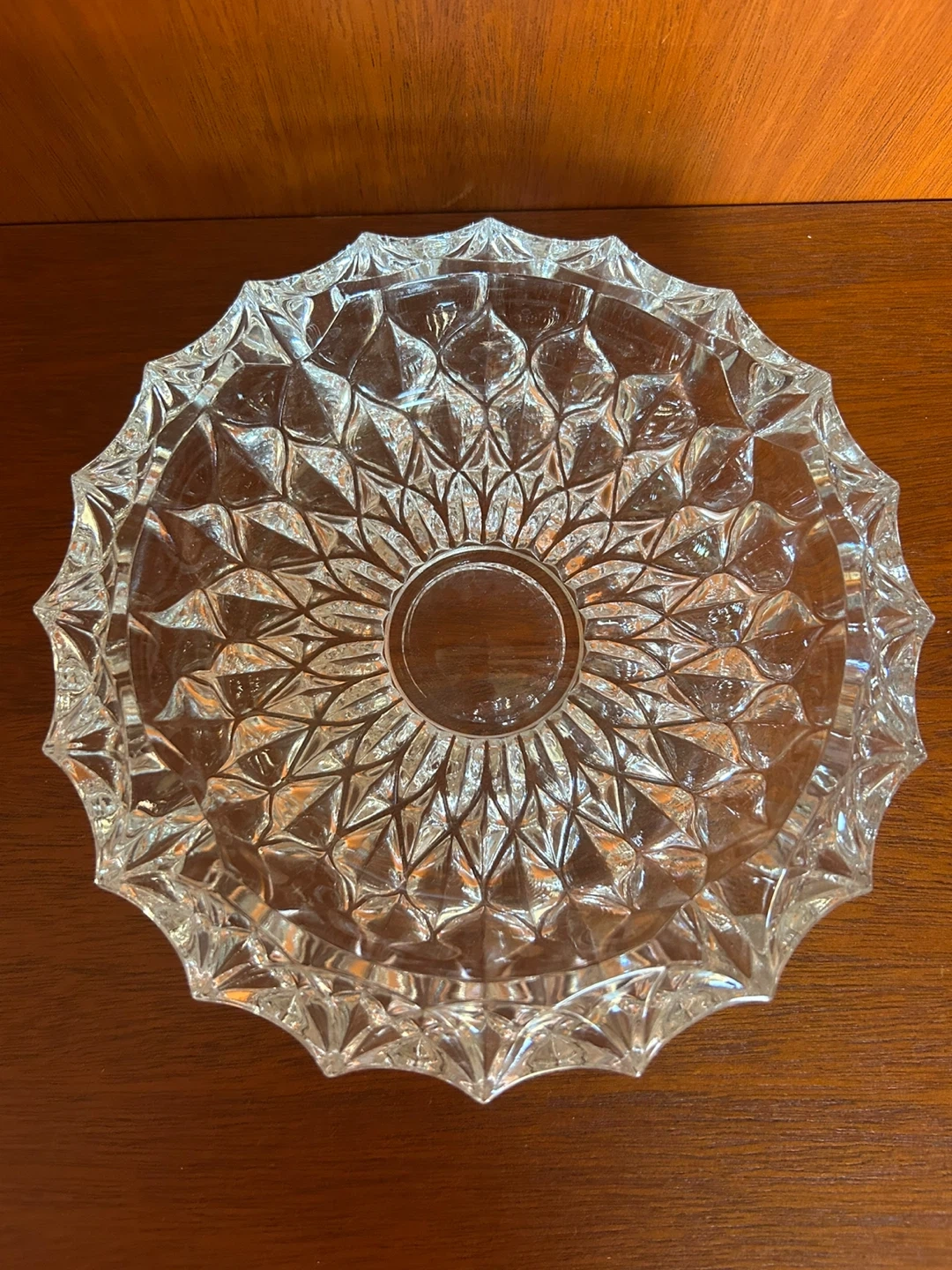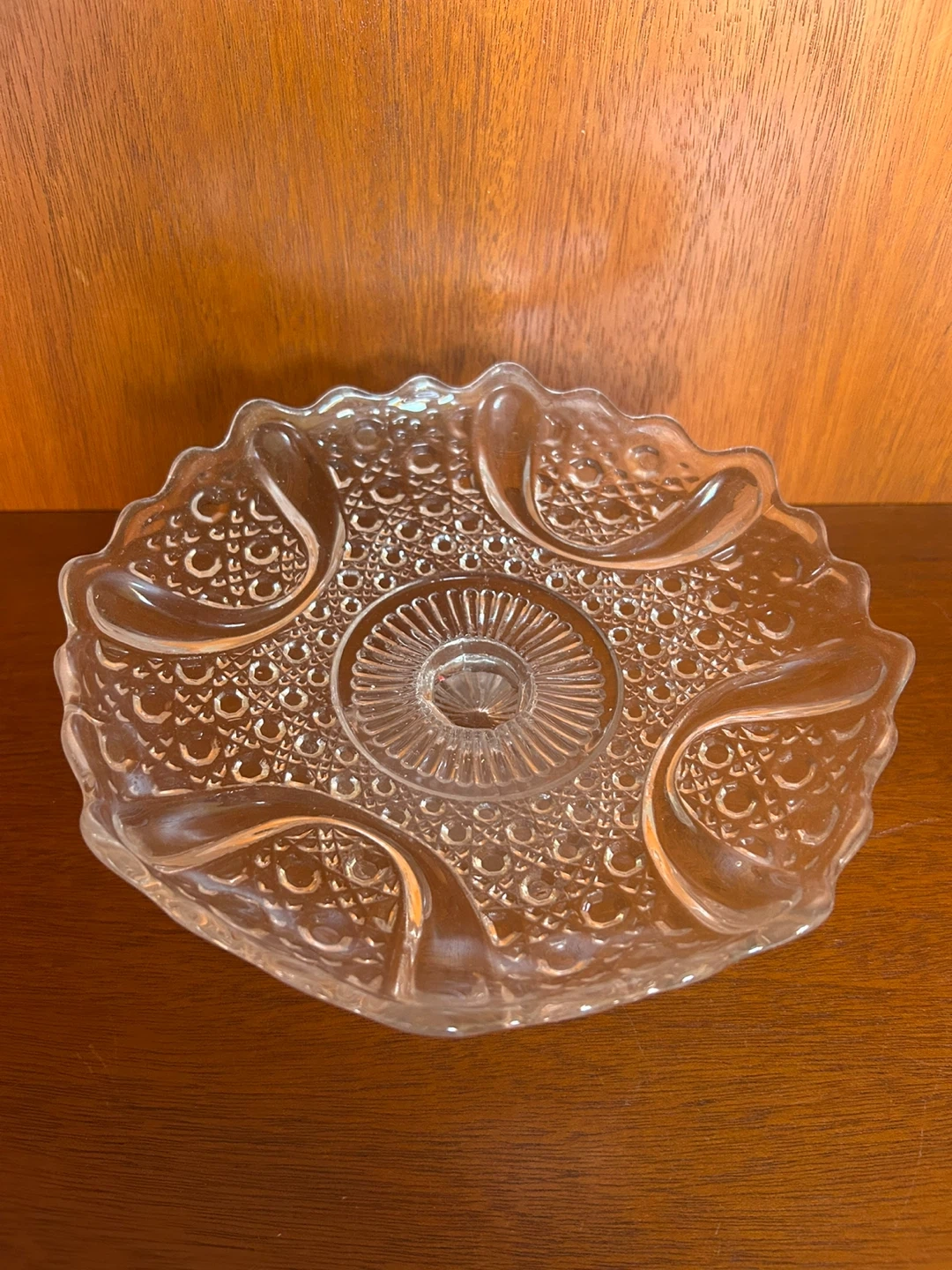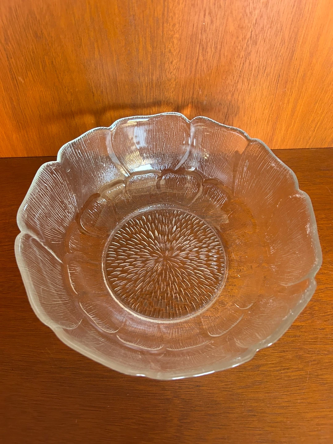 Selling a set of vintage clear glass bowls and a plate. They have beautiful patterns and would look great as decorative pieces or for serving