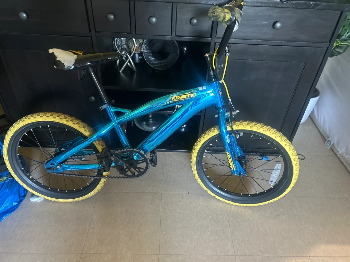 Selling a BMX bike with 18-inch wheels. It's in used condition, perfect for getting around town or hitting the skate park. The bike features a blue frame with yellow tires and accents. Just upholster the seat a little