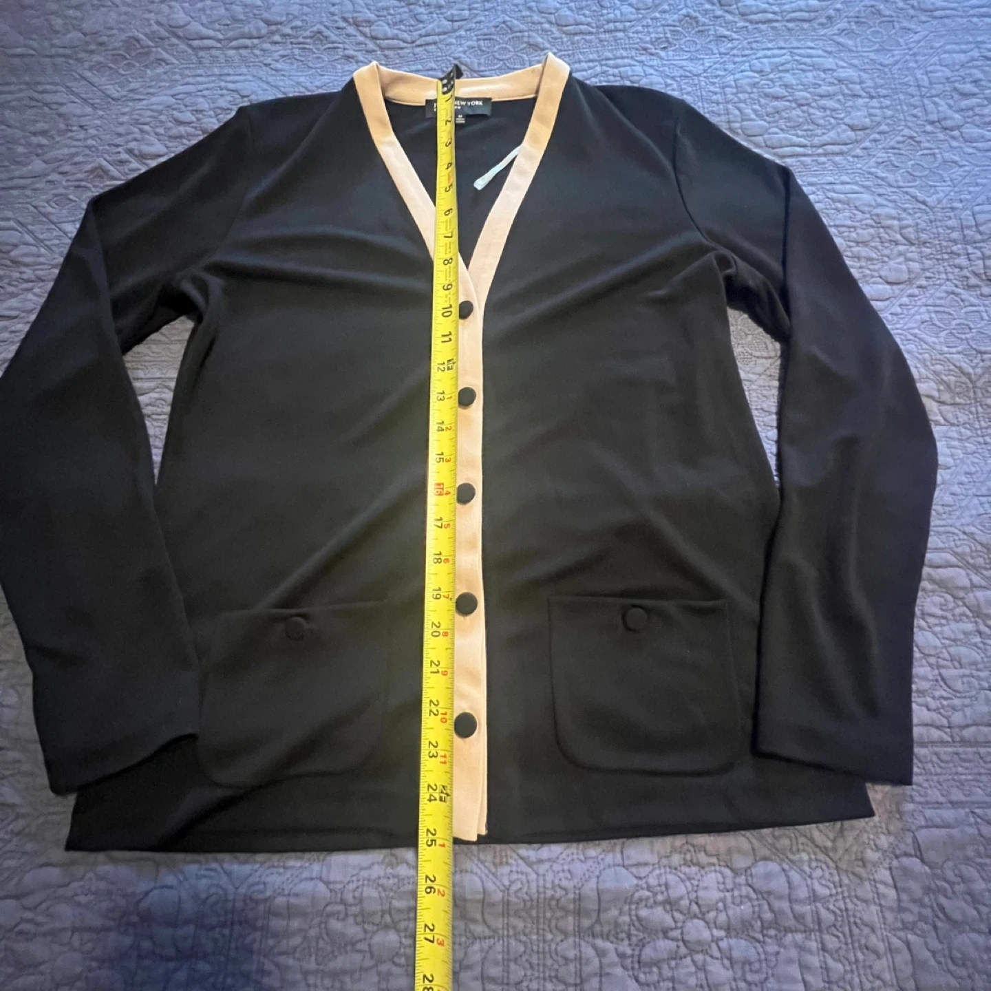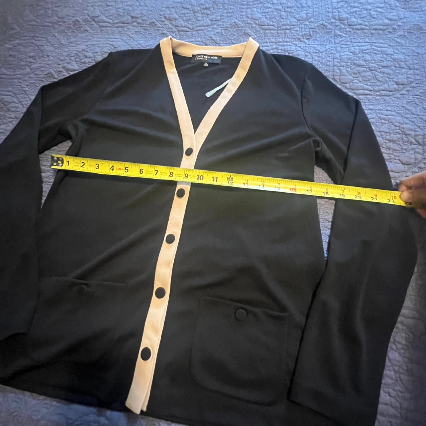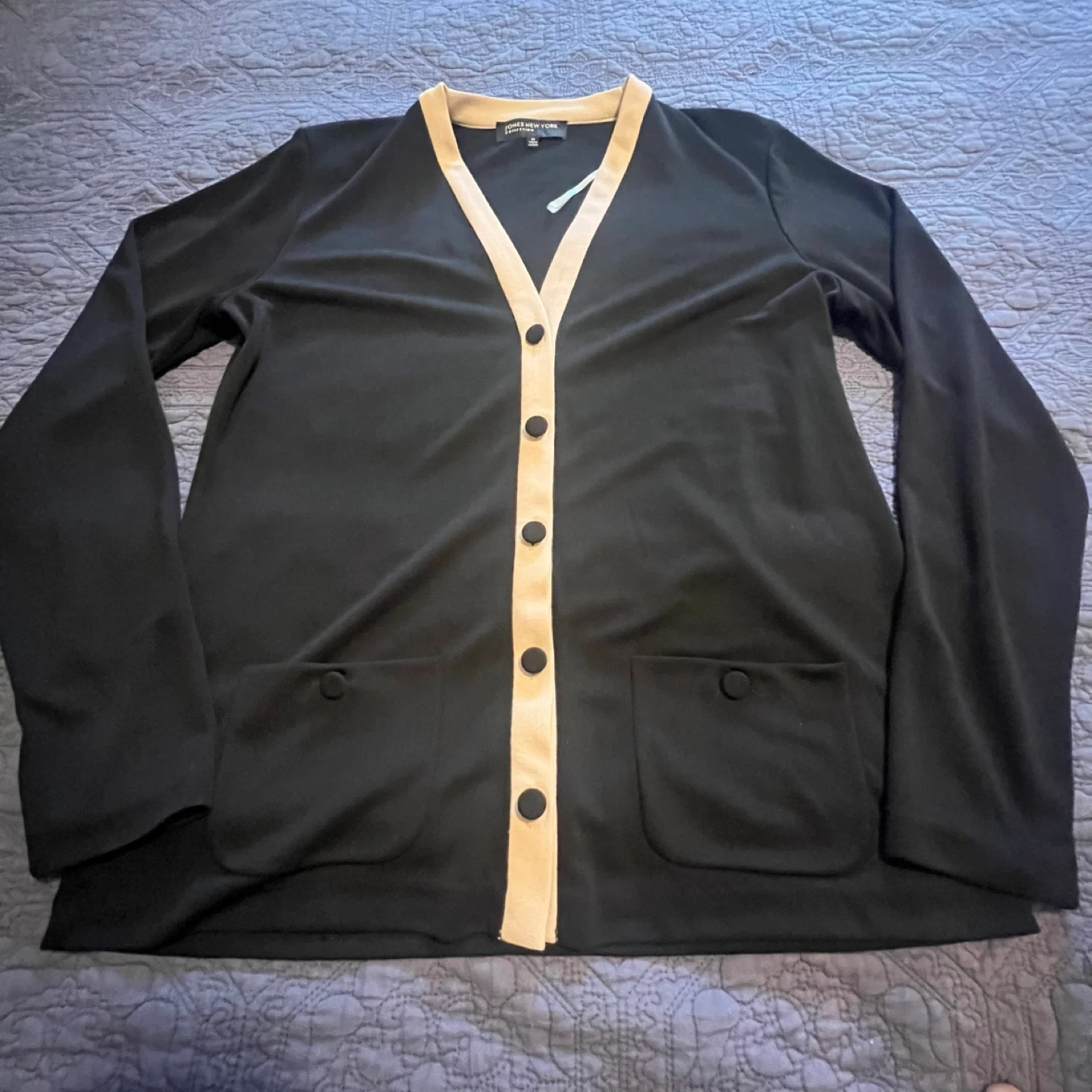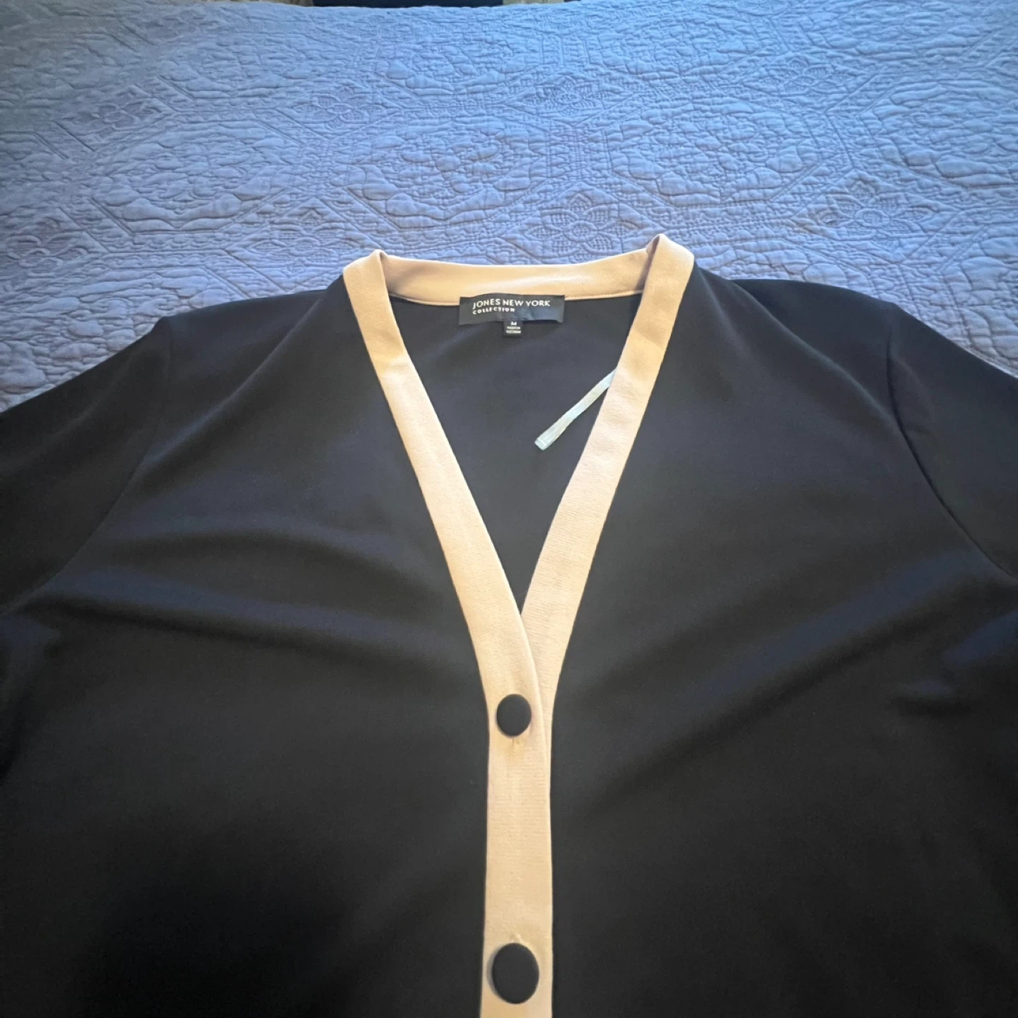 Selling a Jones New York Collection cardigan in size medium. It's a black cardigan with a beige trim and button-up front. Perfect for layering!