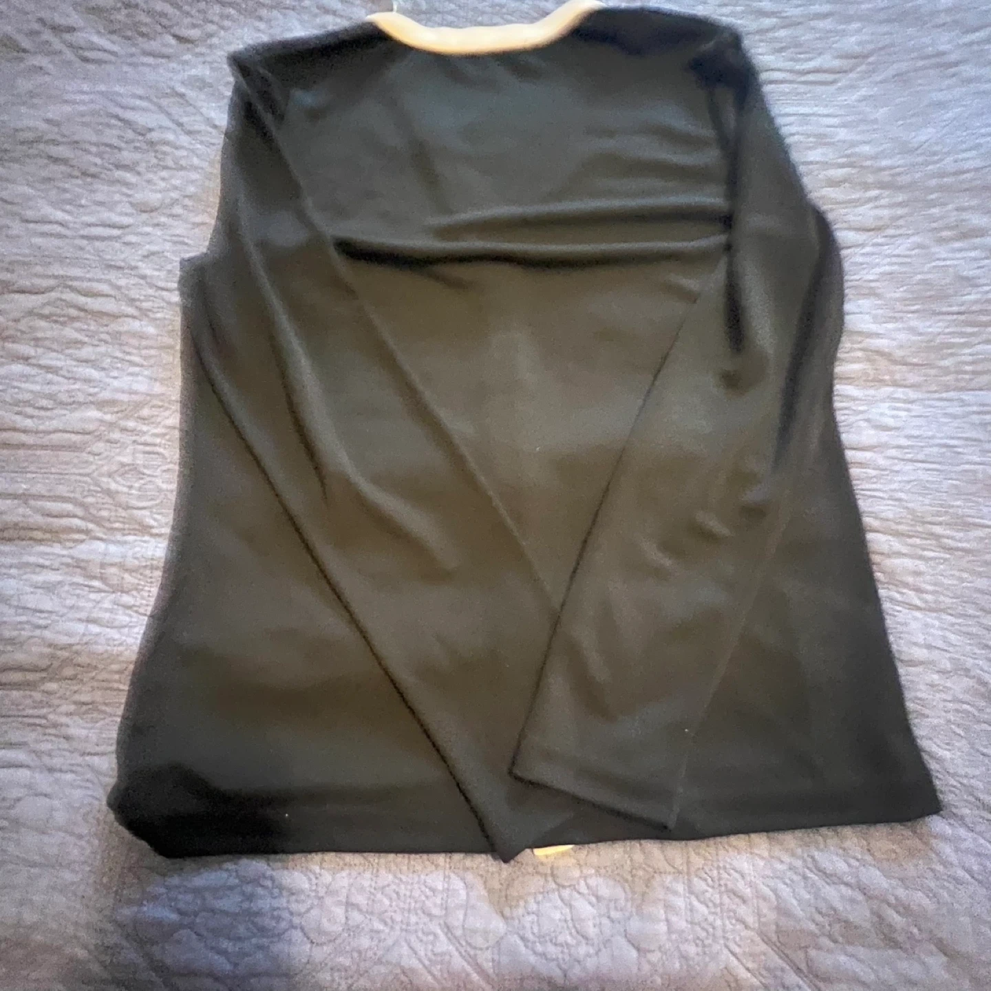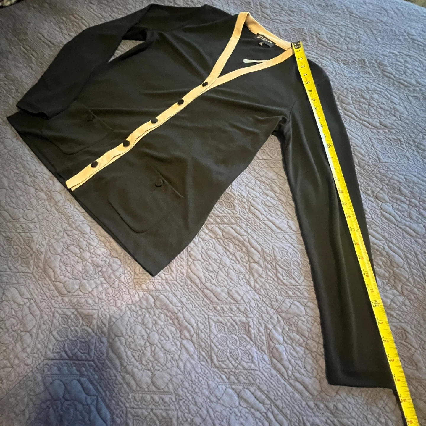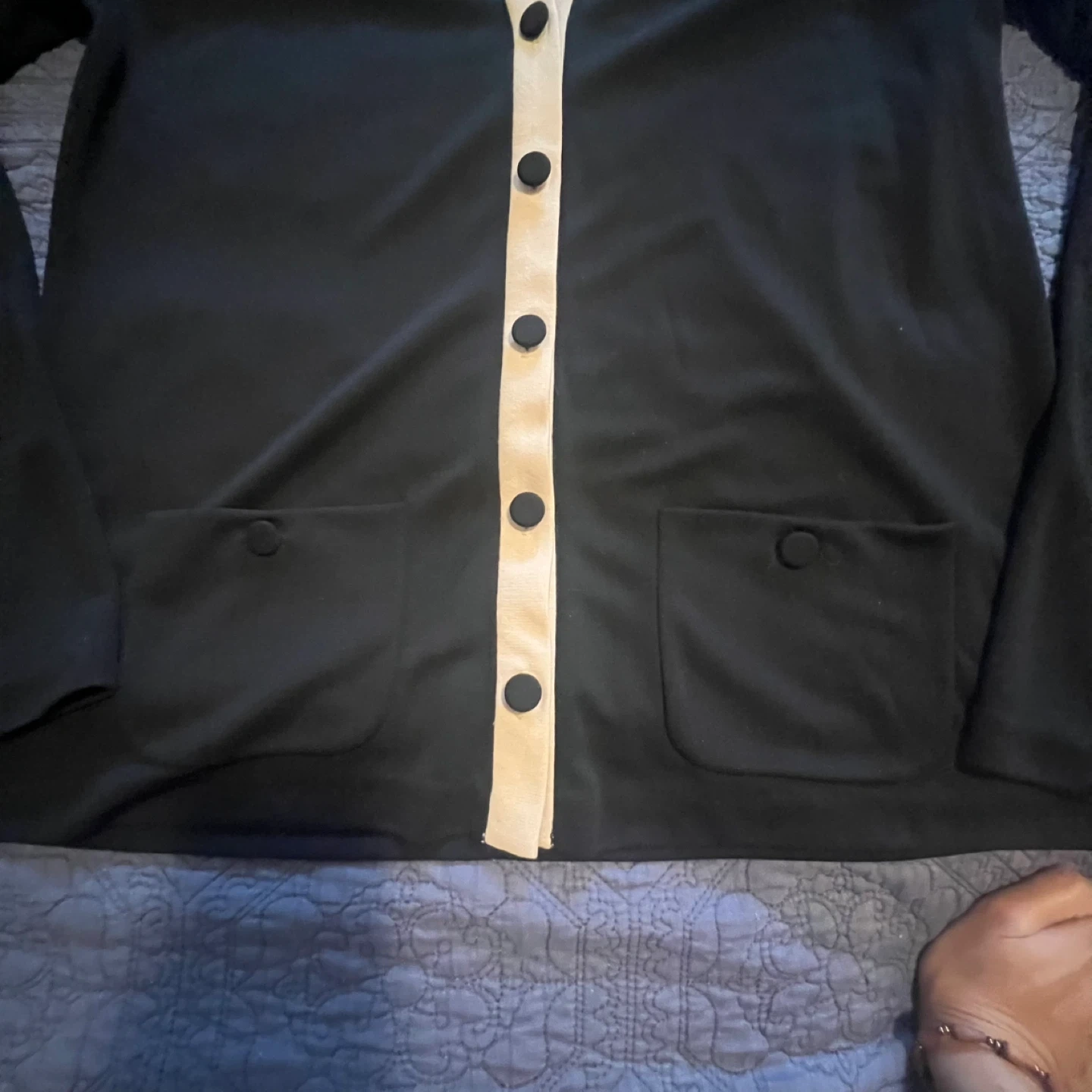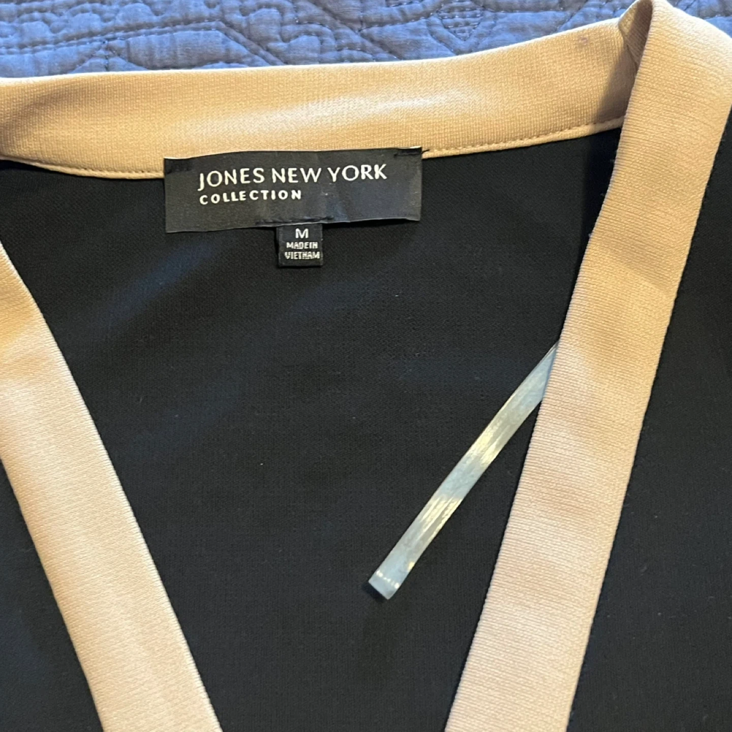 Selling a Jones New York Collection cardigan in size medium. It's a black cardigan with a beige trim and button-up front. Perfect for layering!