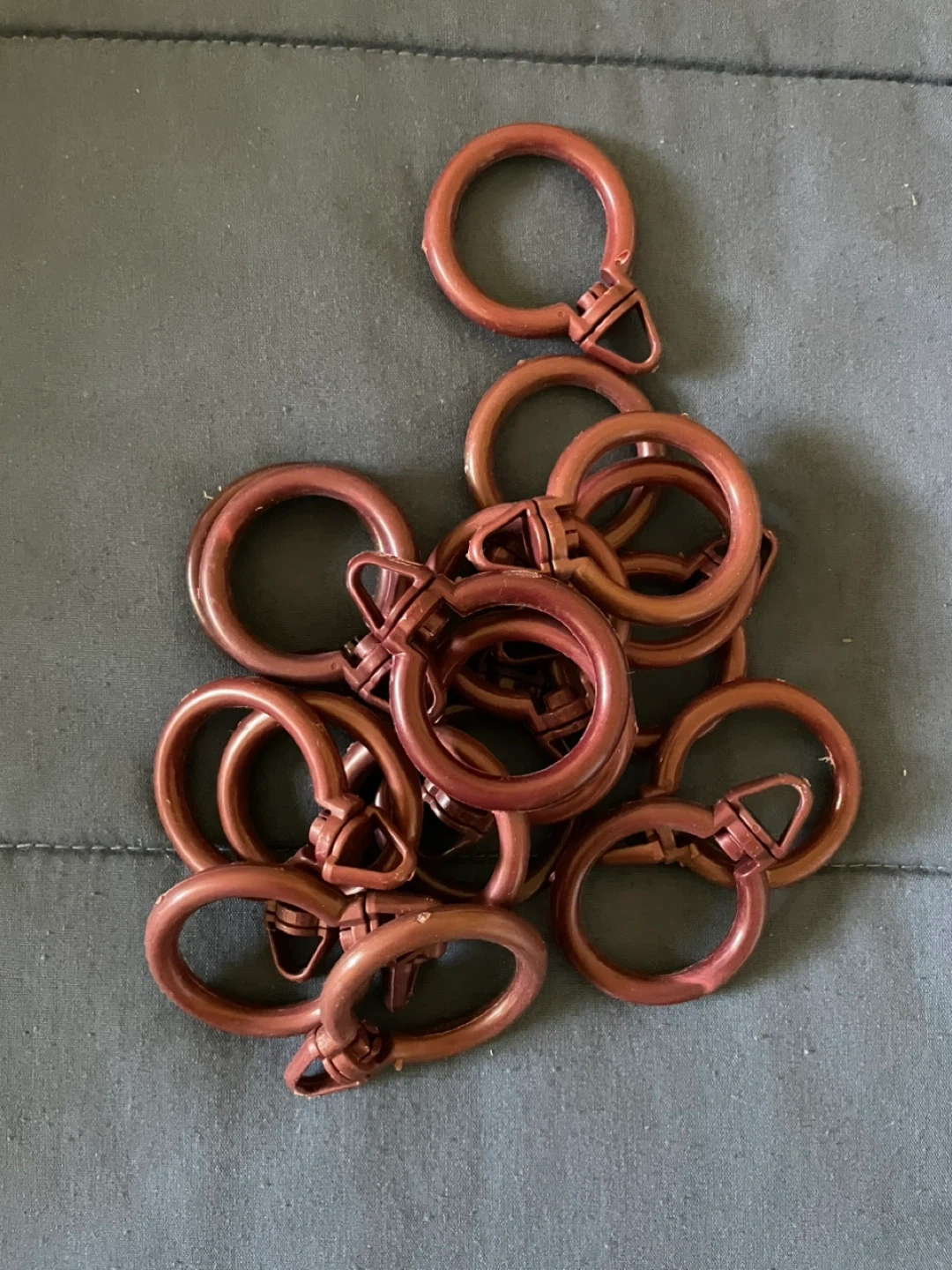 Selling a set of 18 brown bronze-coloured curtain rings with clips. They're in great shape and ready to hang your curtains with style!