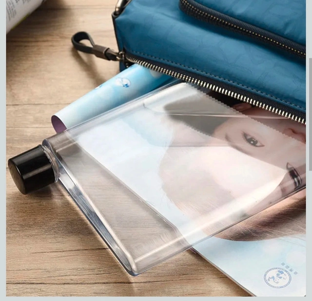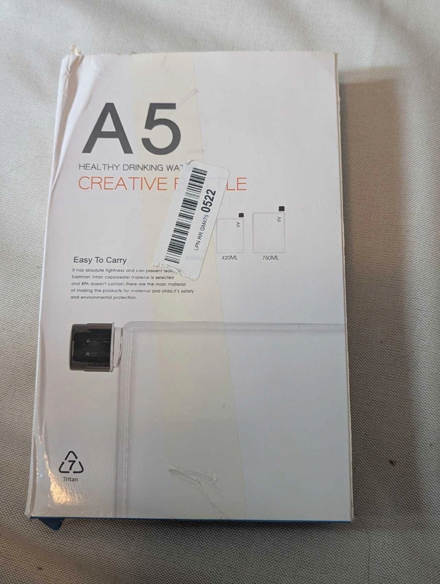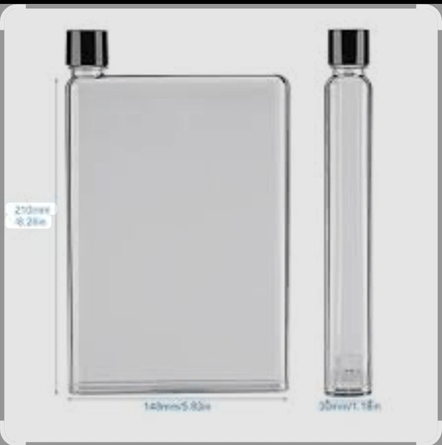 Stay hydrated on the go with this A5 750ml flat water bottle, designed to fit easily into your bag. This bottle is new in the box. Key features: * Capacity: 750ml * Design: Flat, book-like design * Material: Durable, BPA-free plastic * Portability: Fits easily into bags and backpacks Why carry a boring round bottle when you can tote around a sleek, flat one? This water bottle is so cool; it practically begs to be seen. Get yours today and stay hydrated in style! NEW IN ITS ORIGINAL PACKAGING P.S. If the ad is still up, the bottle is still available!