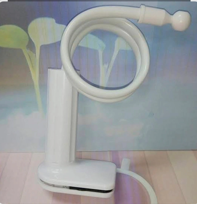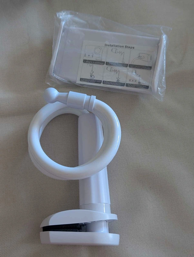 This adjustable gooseneck phone holder features a flexible arm with a clamp base, perfect for desks or bedside tables. It is in new condition, still in its original packaging. Here are some other details: * Flexible gooseneck design * Sturdy clamp base * 360-degree rotation * Compatible with most smartphones