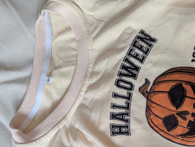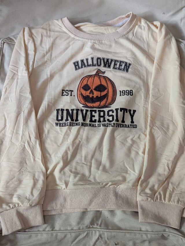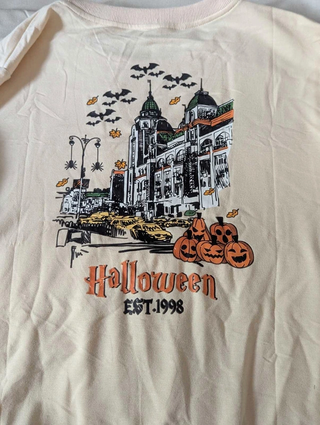 Get ready for spooky season with this Halloween University Sweater, size XL! This festive cream-coloured sweater features a playful design on both the front and back. The front showcases a grinning jack-o'-lantern and the words 'Halloween University Est. 1998,' while the back features a spooky cityscape with bats and more pumpkins. Size: Extra Large (XL) Colour: Cream Design: Halloween University with pumpkin and cityscape motifs Condition: Used - Good This sweater is ready to add some Halloween fun to your wardrobe! If you're wondering if this ad is still up, the answer is yes! Grab it before it vanishes into the night!