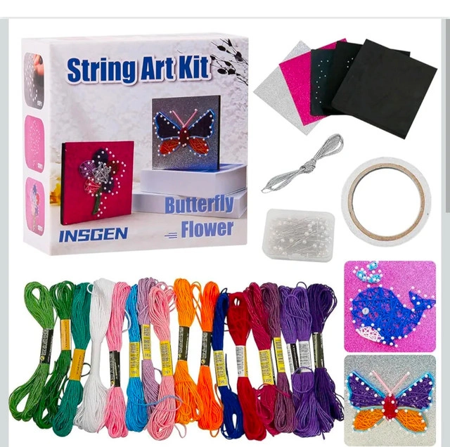 Create delightful string art with this new INSGEN String Art Kit, perfect for crafting a butterfly and flower design. This all-inclusive kit contains everything you need to get started, making it a wonderful gift or a fun project for yourself! NEW IN ITS ORIGINAL PACKAGING Kit includes: * Patterned project boards * Embroidery floss * Nails * Instructions Unleash your inner artist and add a touch of handmade charm to your space. If the ad is up, it's available!