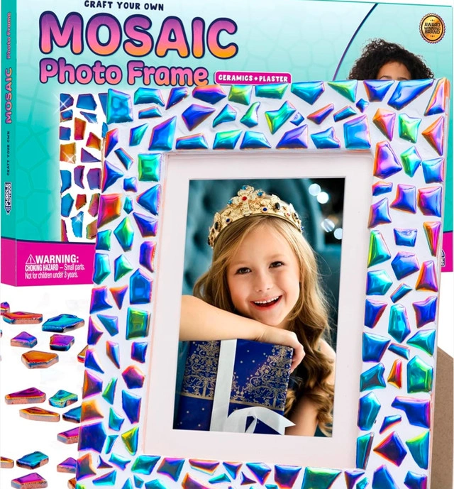 I'm selling a new mosaic photo frame kit, perfect for a fun and creative activity. This kit includes everything you need to create your own shimmery mosaic frame. It is an award-winning brand and is suitable for ages 8+. It's just waiting for a new home to spark some artistic joy!