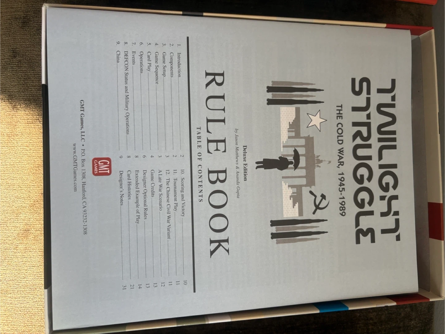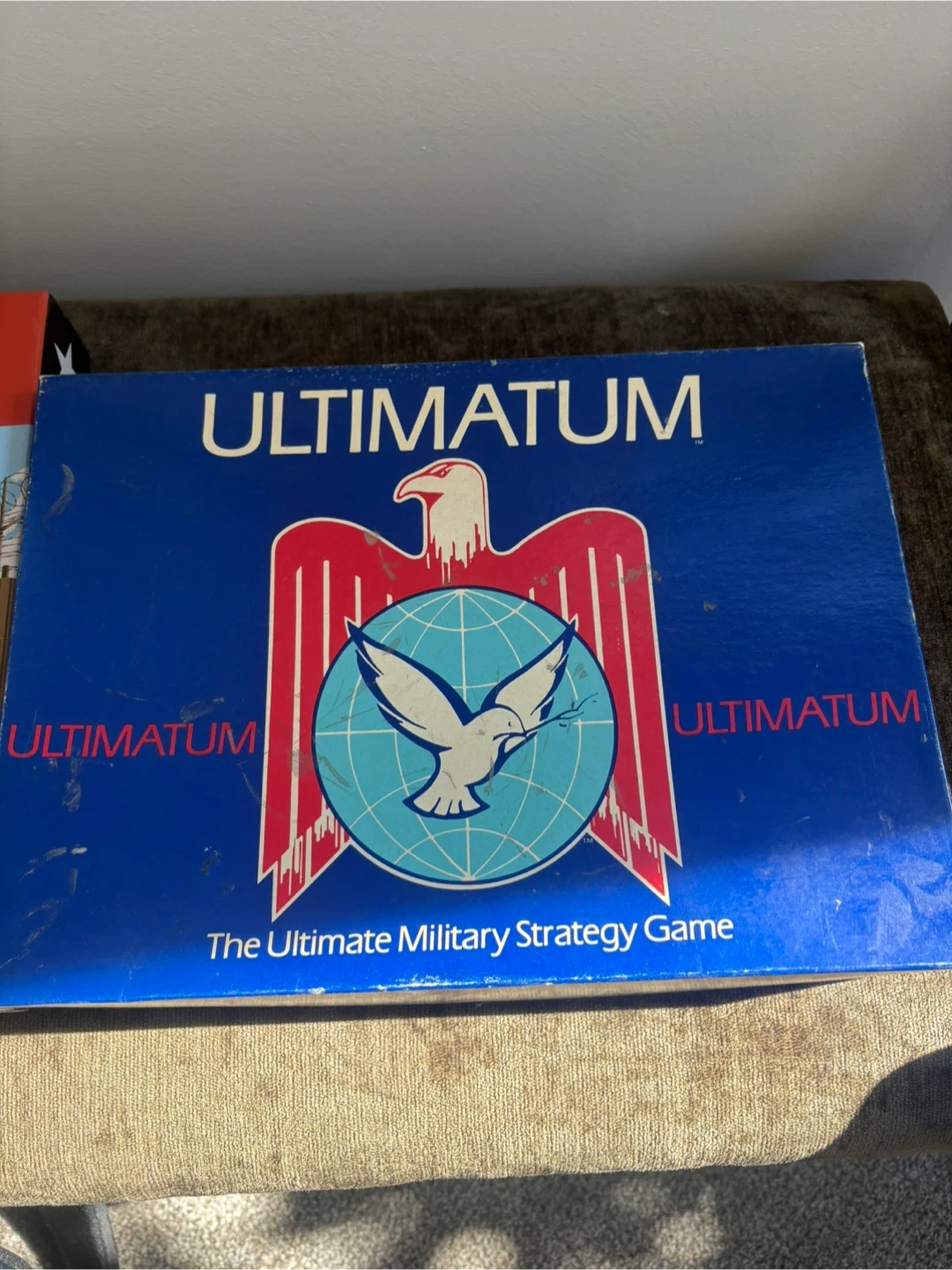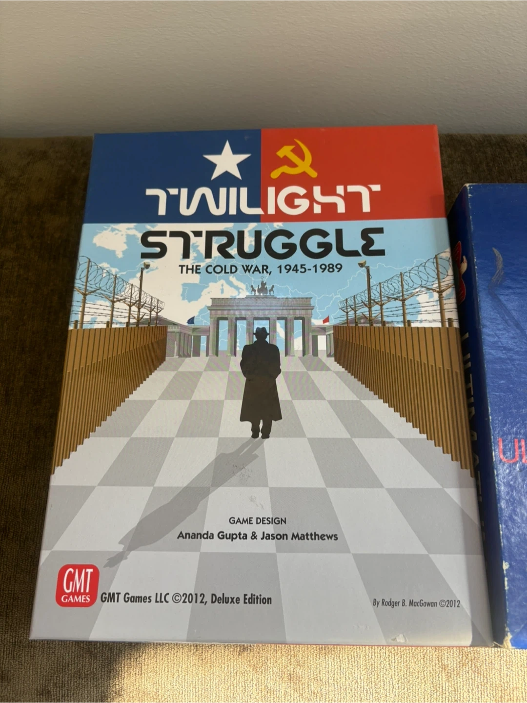 Selling a copy of Twilight Struggle: The Cold War, 1945-1989 board game. It's the Deluxe Edition by GMT Games. Comes with all the components and the rule book. Great strategy game! As well as another military strategy game Ultimatum - also with instructions and all accessories Per and smoke free home Ultimatum has has lots of play time and twilight has only been played 2x I am clearing these out as they were more for a game with friends and family - as I’ve gotten older I don’t have time to play these and my gamers friends have kids now so I will hope these delight a new group