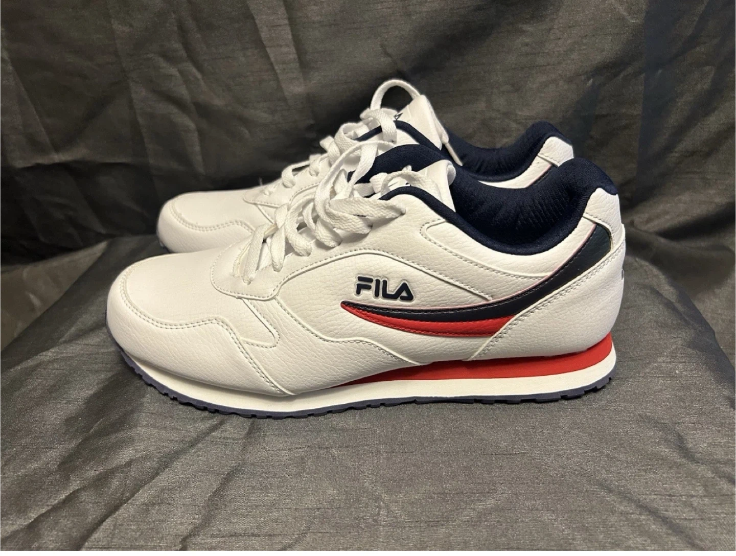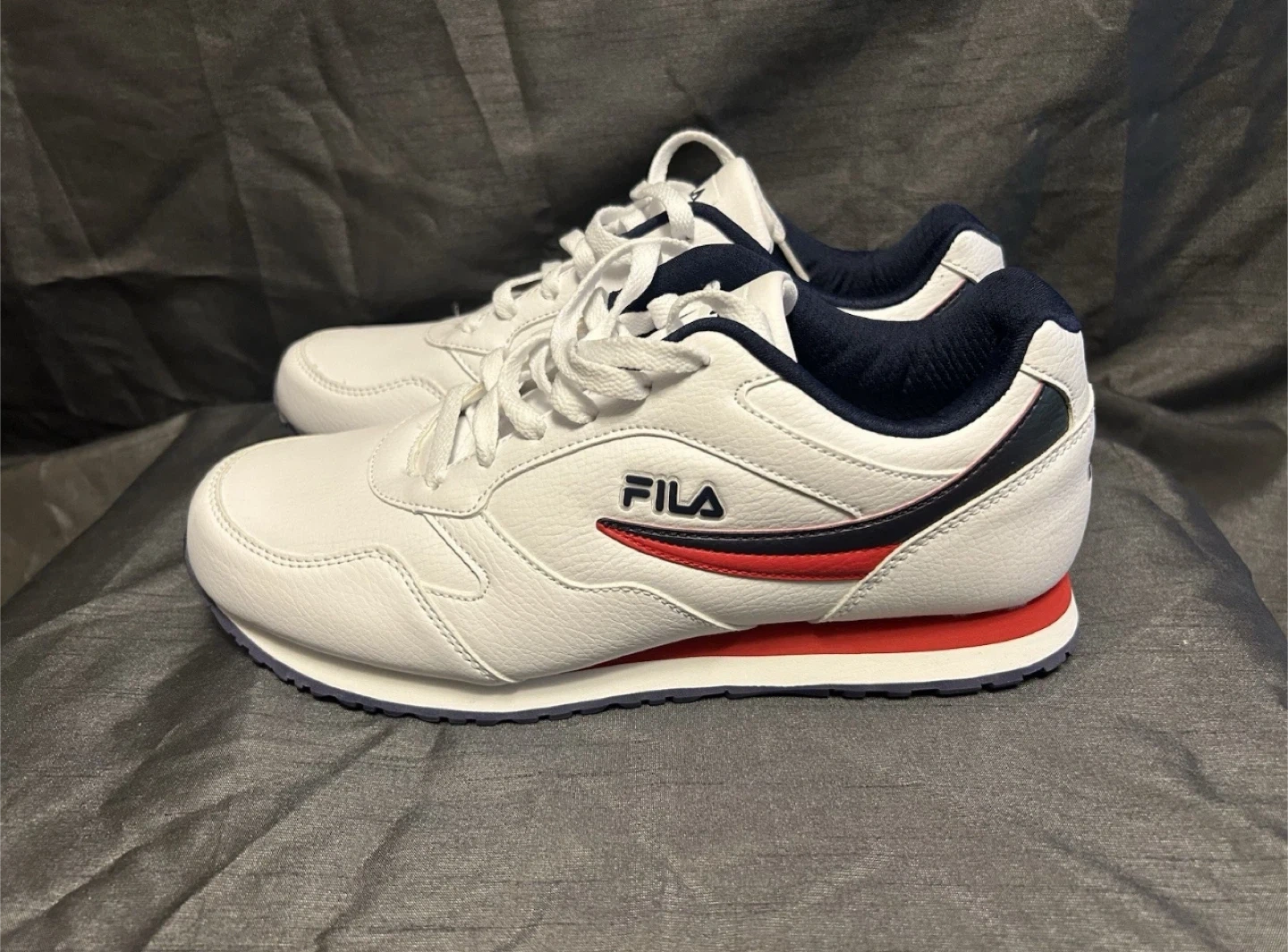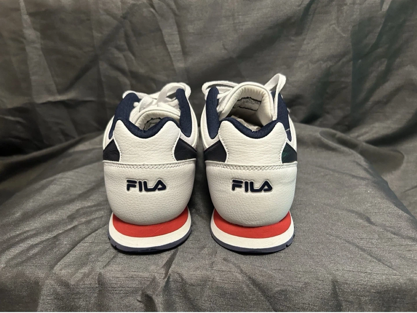 Selling a pair of Fila sneakers in white leather. They're in great shape and ready for a new home! These sneakers feature a classic design with red and navy accents. Perfect for everyday wear!