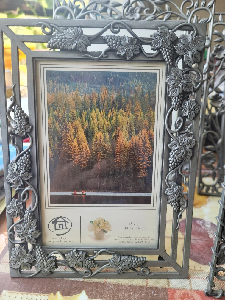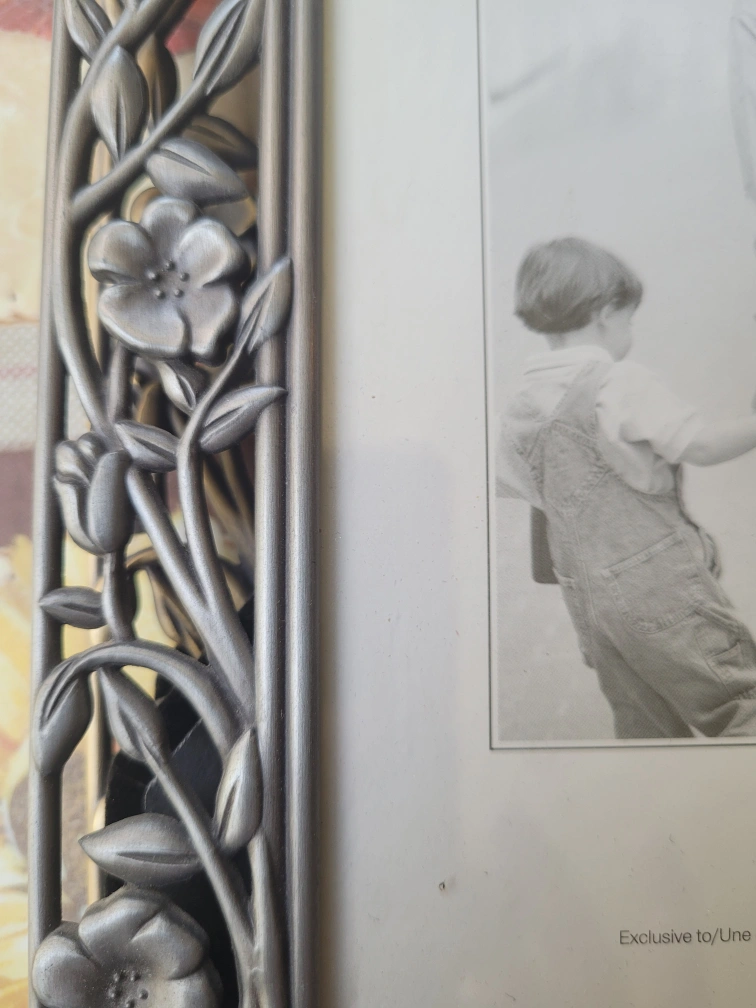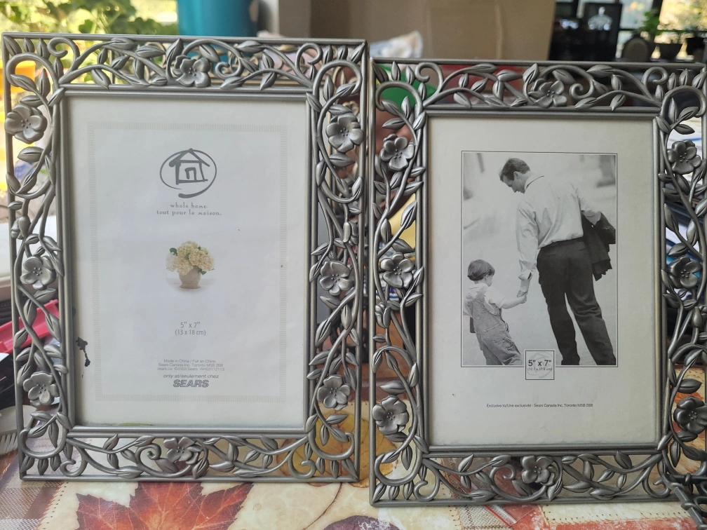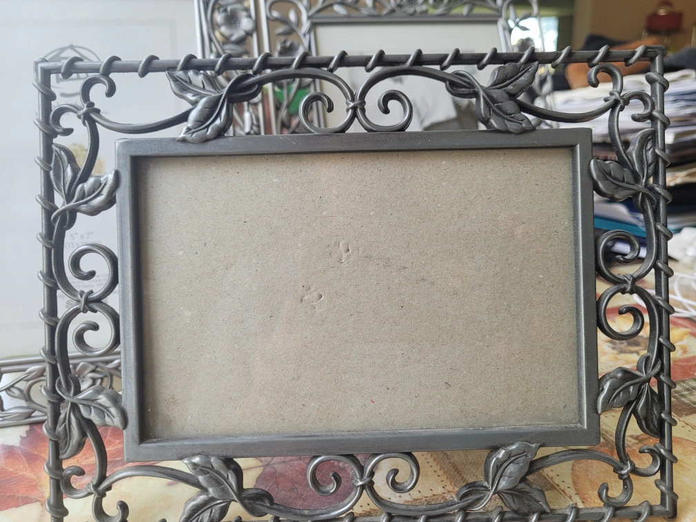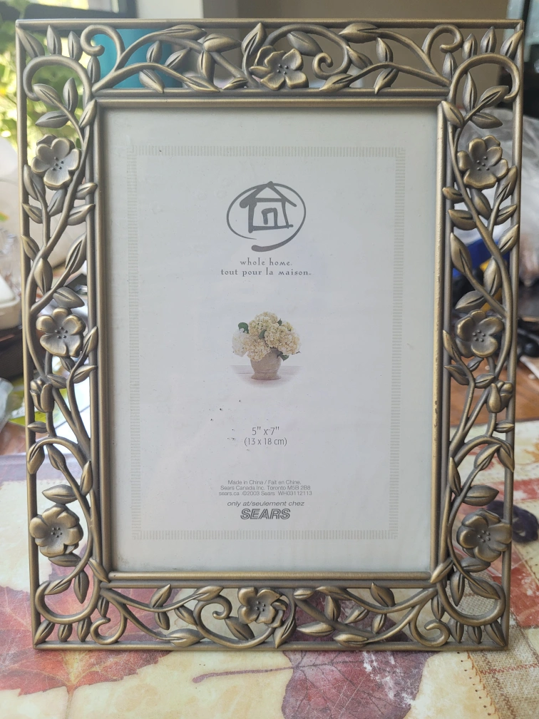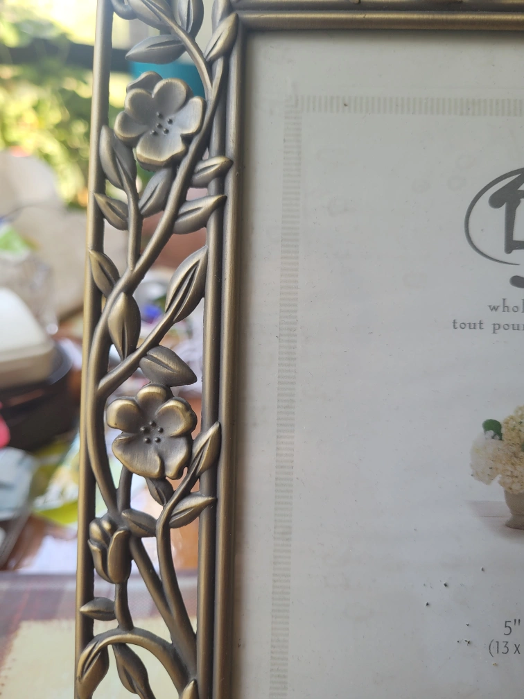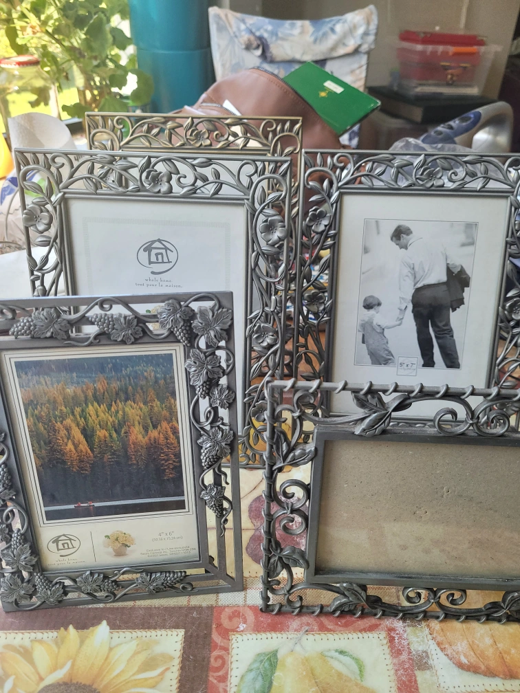 Selling a set of five Whole Home picture frames. They come in various sizes, including 5" x 7" and 4" x 6". The frames feature beautiful floral and grapevine designs, adding a touch of elegance to any room. Perfect for displaying your cherished memories!