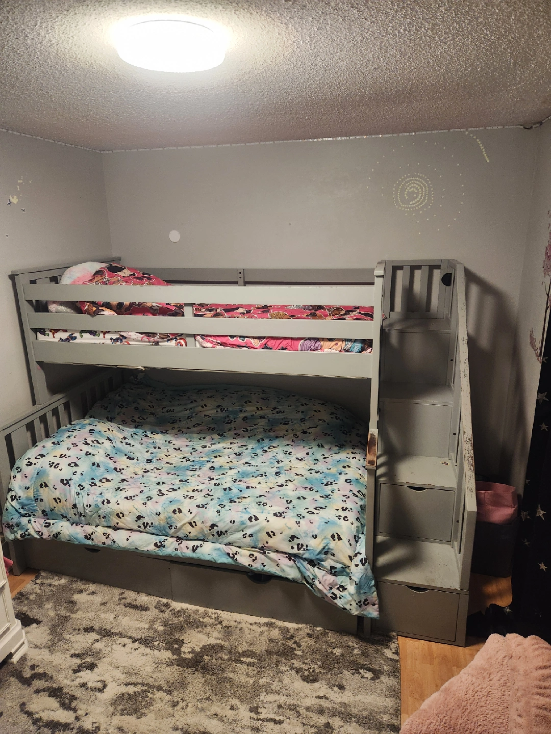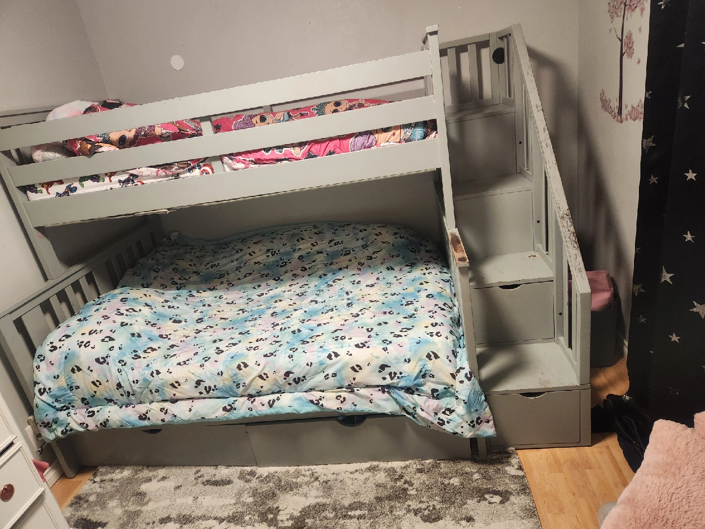 Selling a grey bunk bed with a removable staircase! It's in good condition and has a sturdy frame. The staircase also includes drawers for extra storage, which is super handy. Perfect for kids' rooms or guest rooms! also has 2 underbed large storage drawers . needs to be repainted.. was espresso color from.costco..we painted this grey..single over double