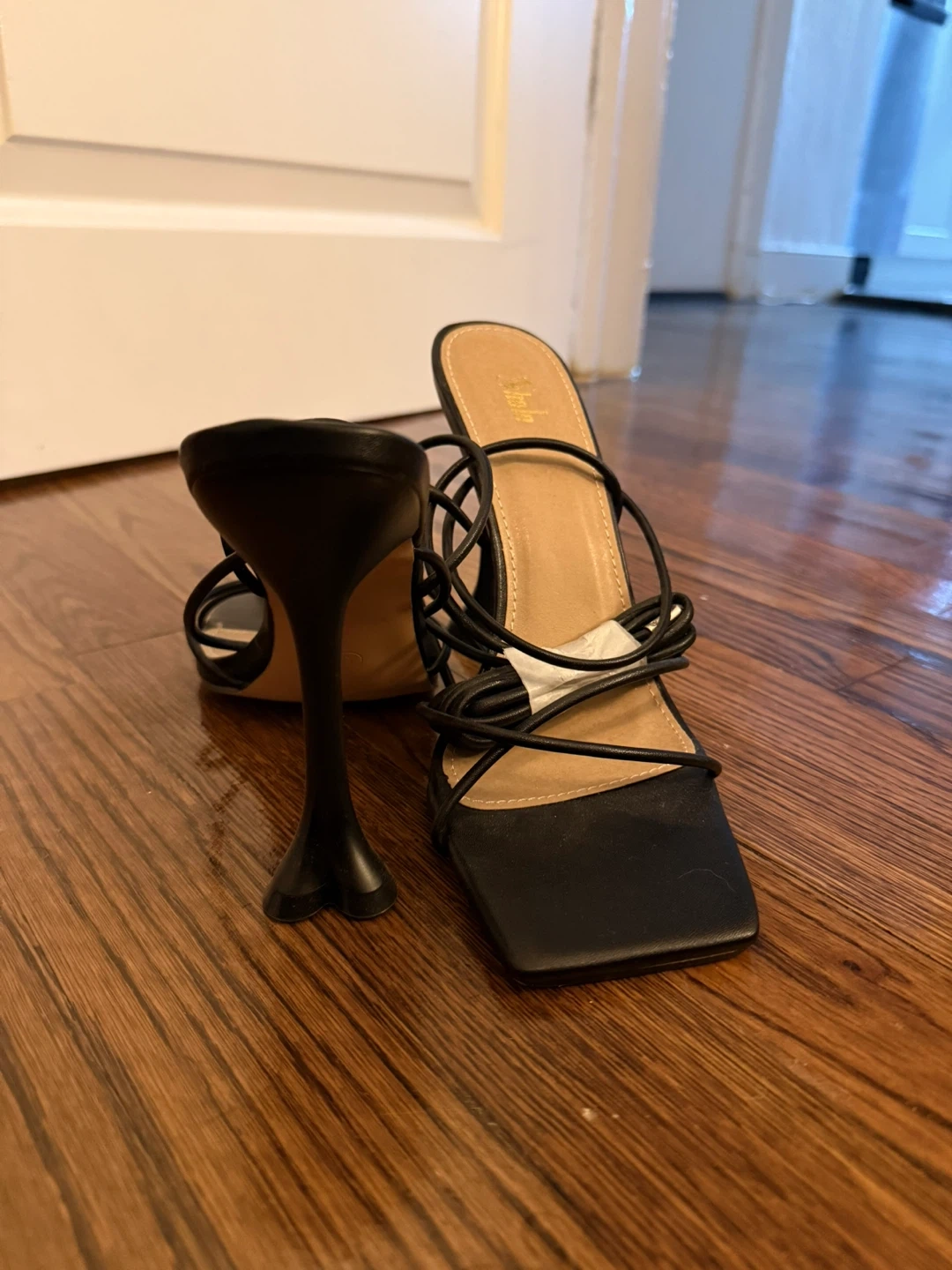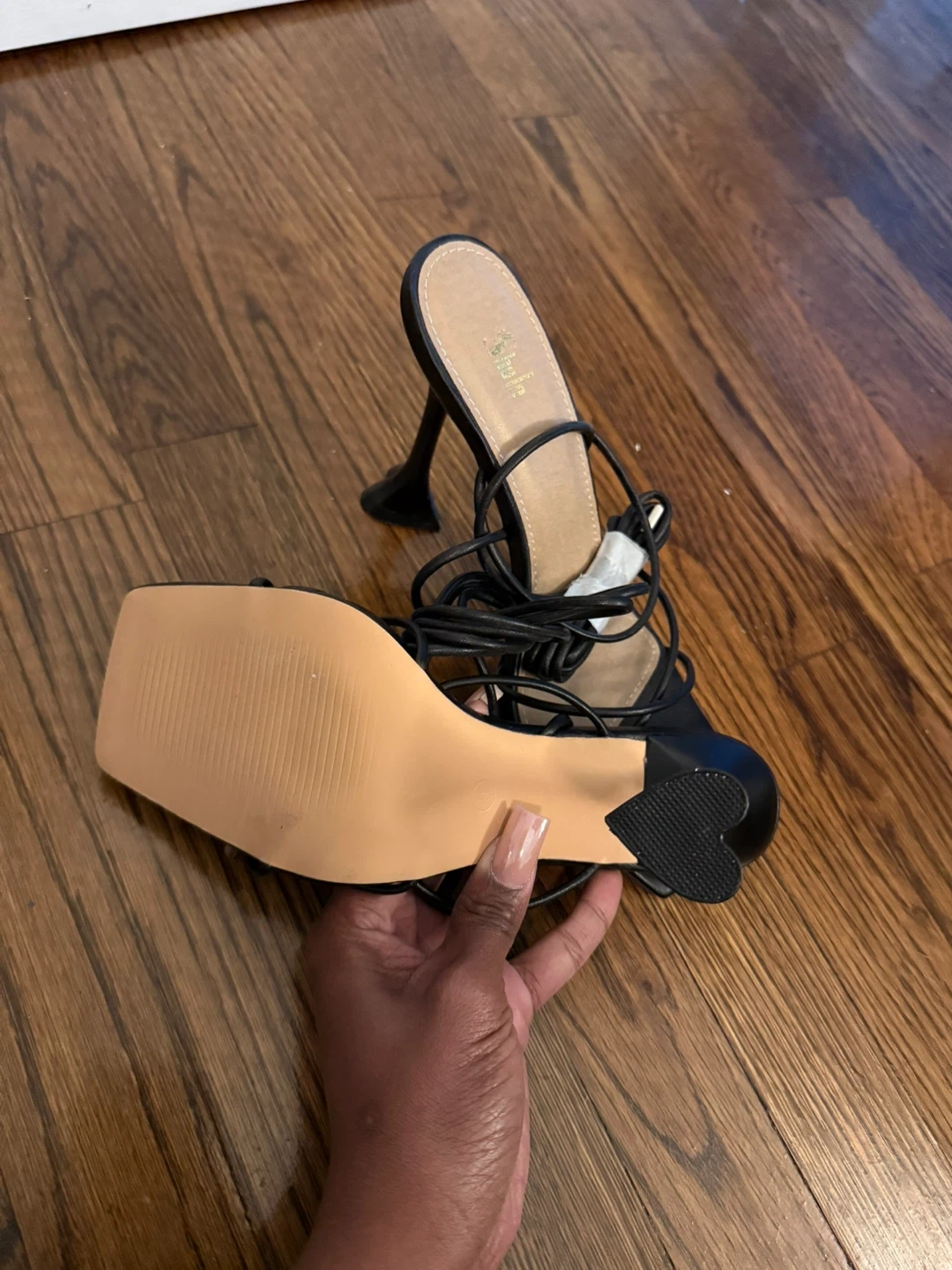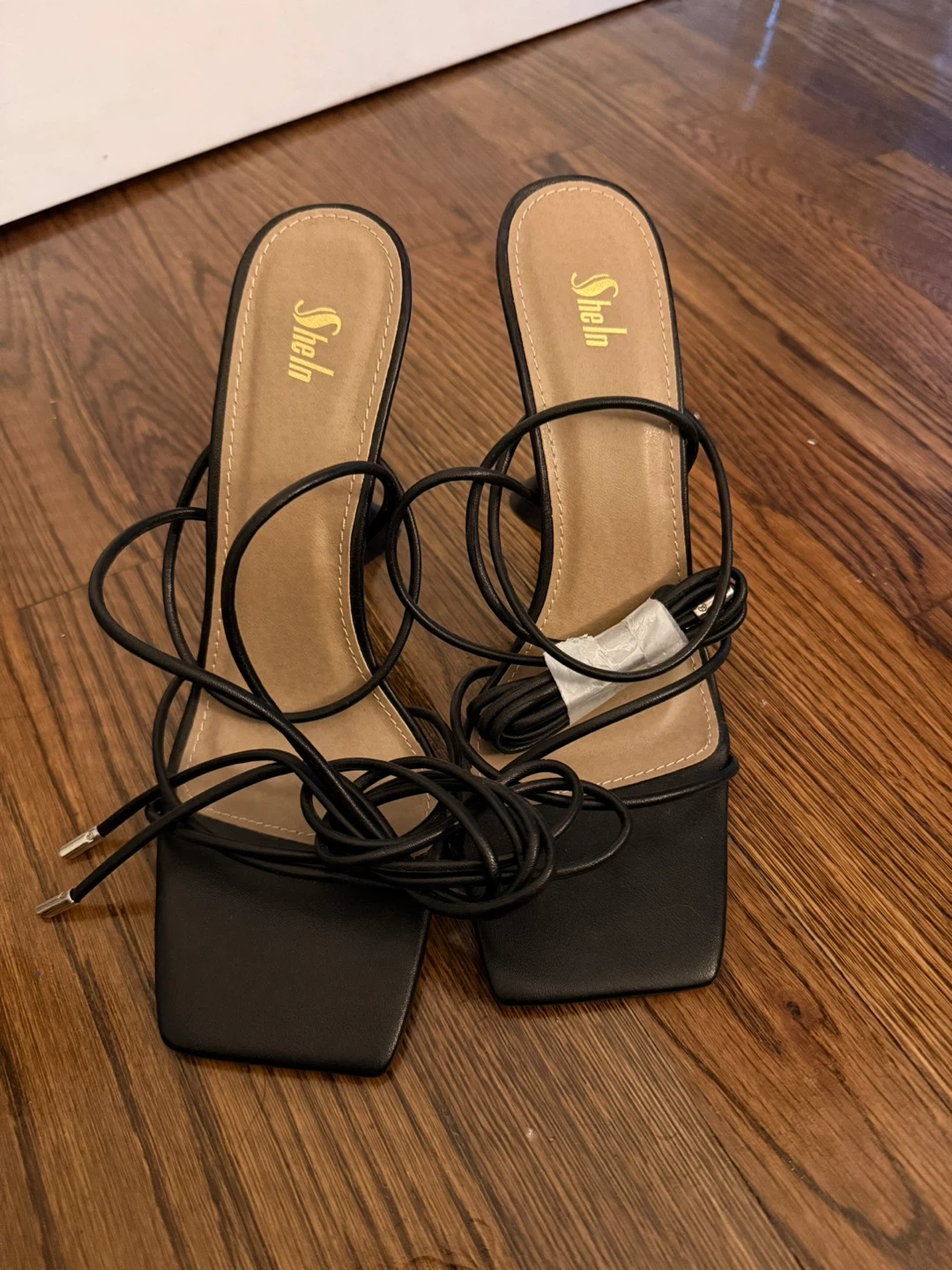 Selling a pair of black heels from Shein. They're a size 9 and feature a unique lace-up design and heart heel. Perfect for dressing up any outfit! Never worn.