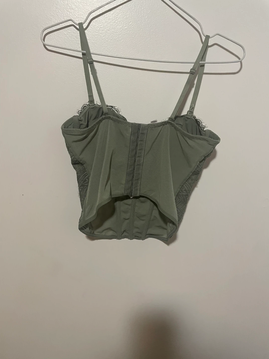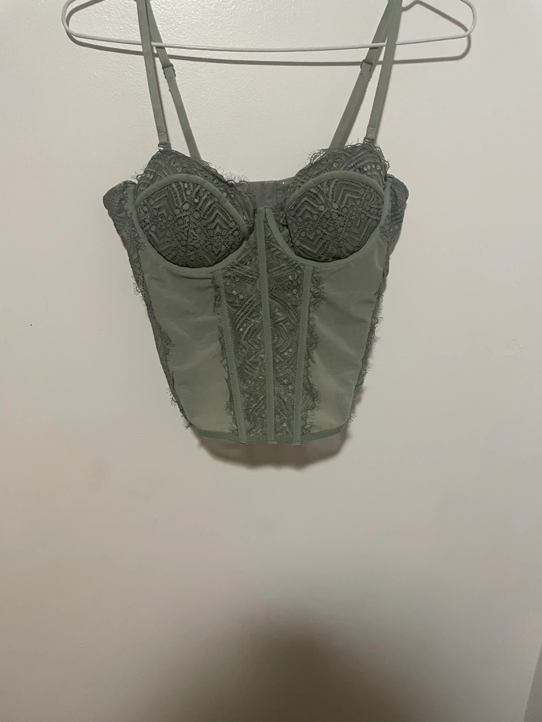 Selling a cute Urban Outfitters corset top in sage green! It's in great condition and features delicate lace detailing. Perfect for adding a touch of elegance to any outfit