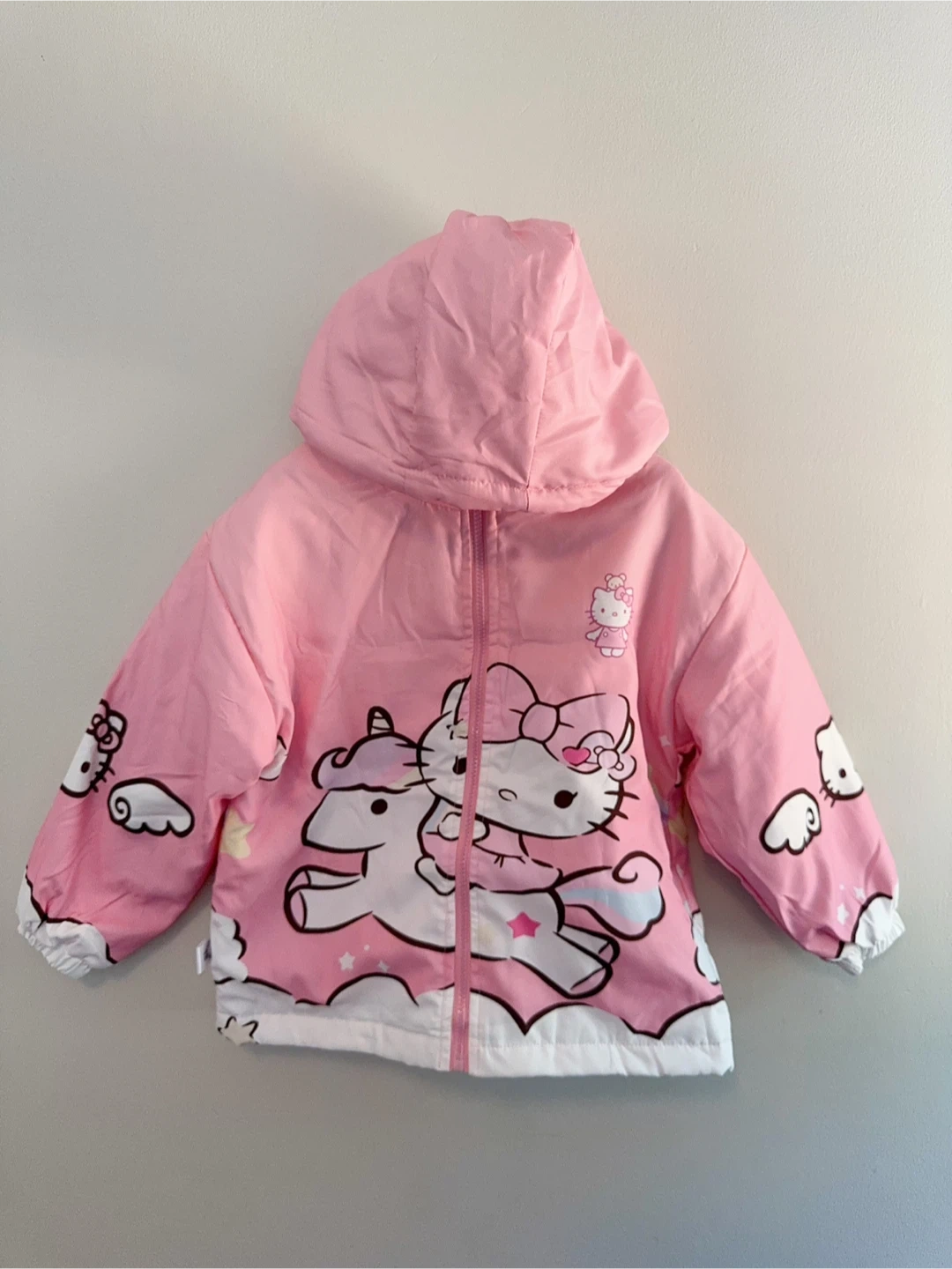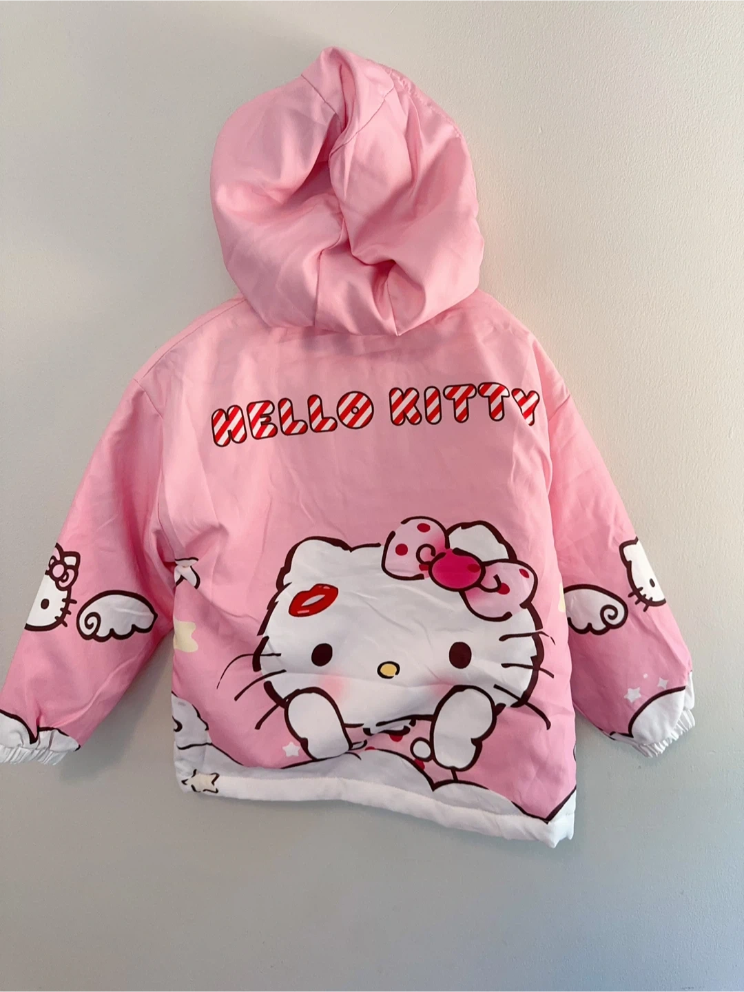 Super cute Hello Kitty puffer jacket for kids! It's pink with a hood and features Hello Kitty designs. Perfect for keeping your little one warm and stylish!