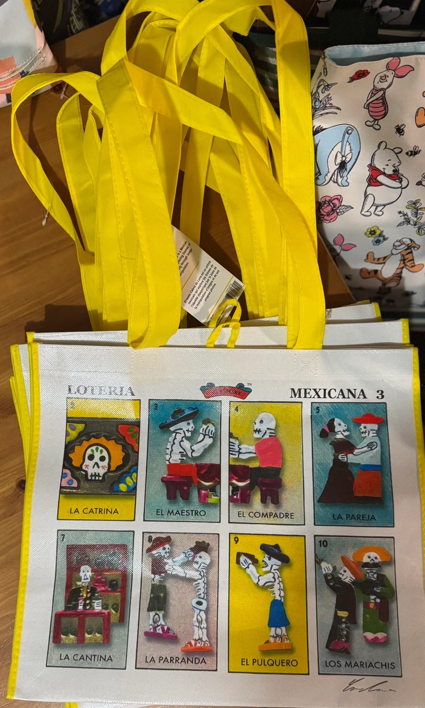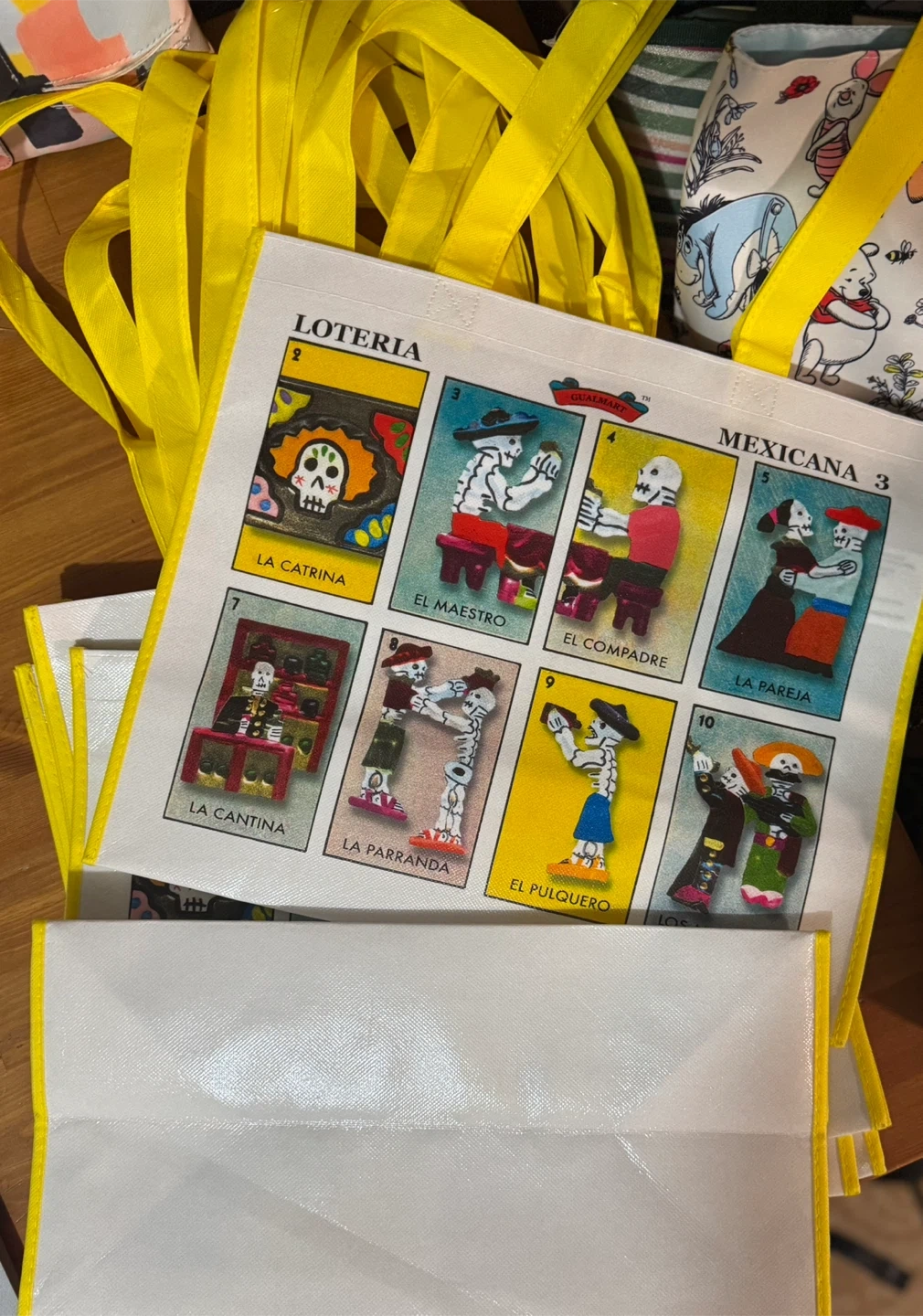 Loteria Mexicana tote bag featuring colourful images of La Catrina, El Maestro, El Compadre, La Pareja, La Cantina, La Parranda, El Pulquero, and Los Mariachis