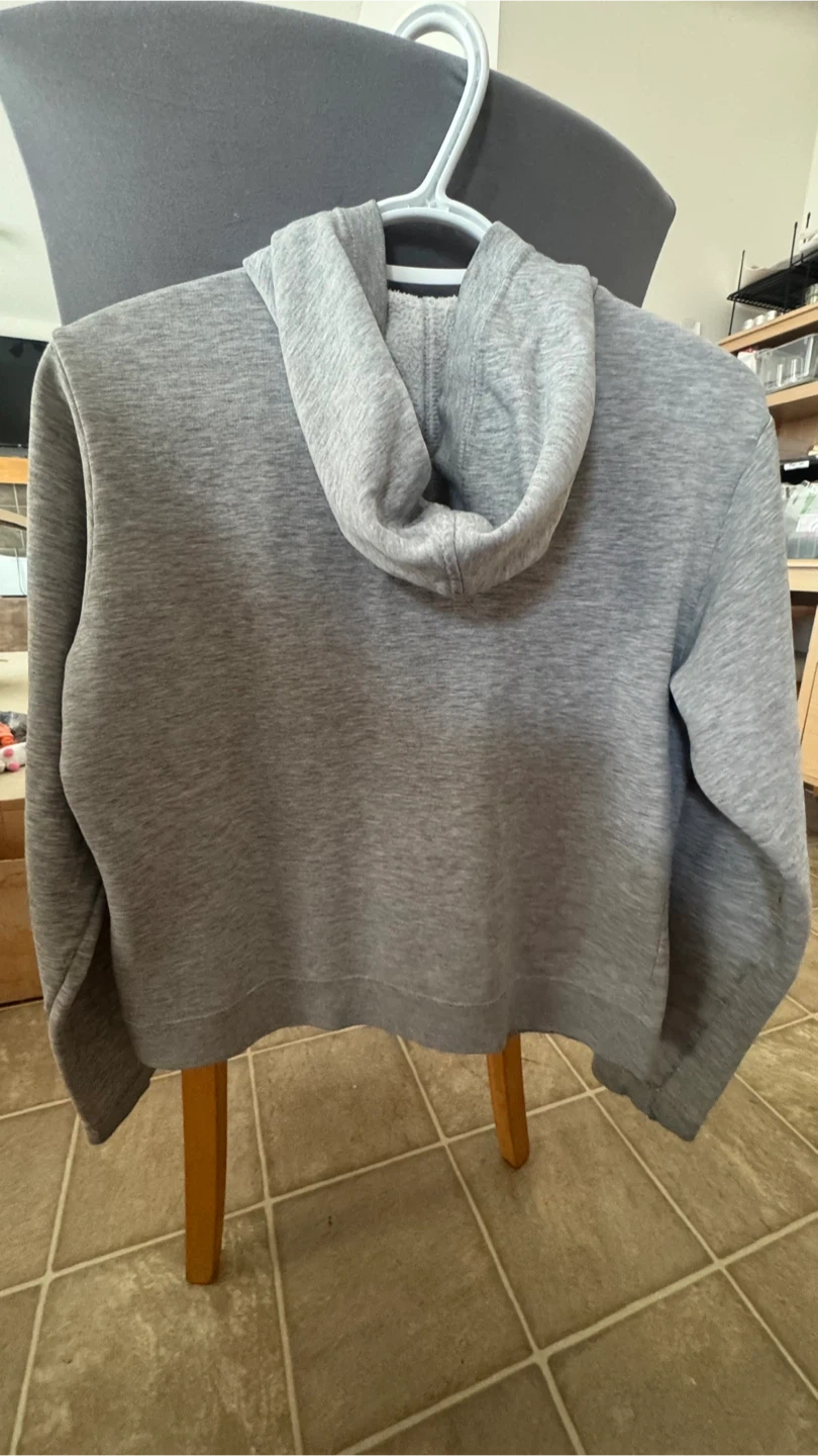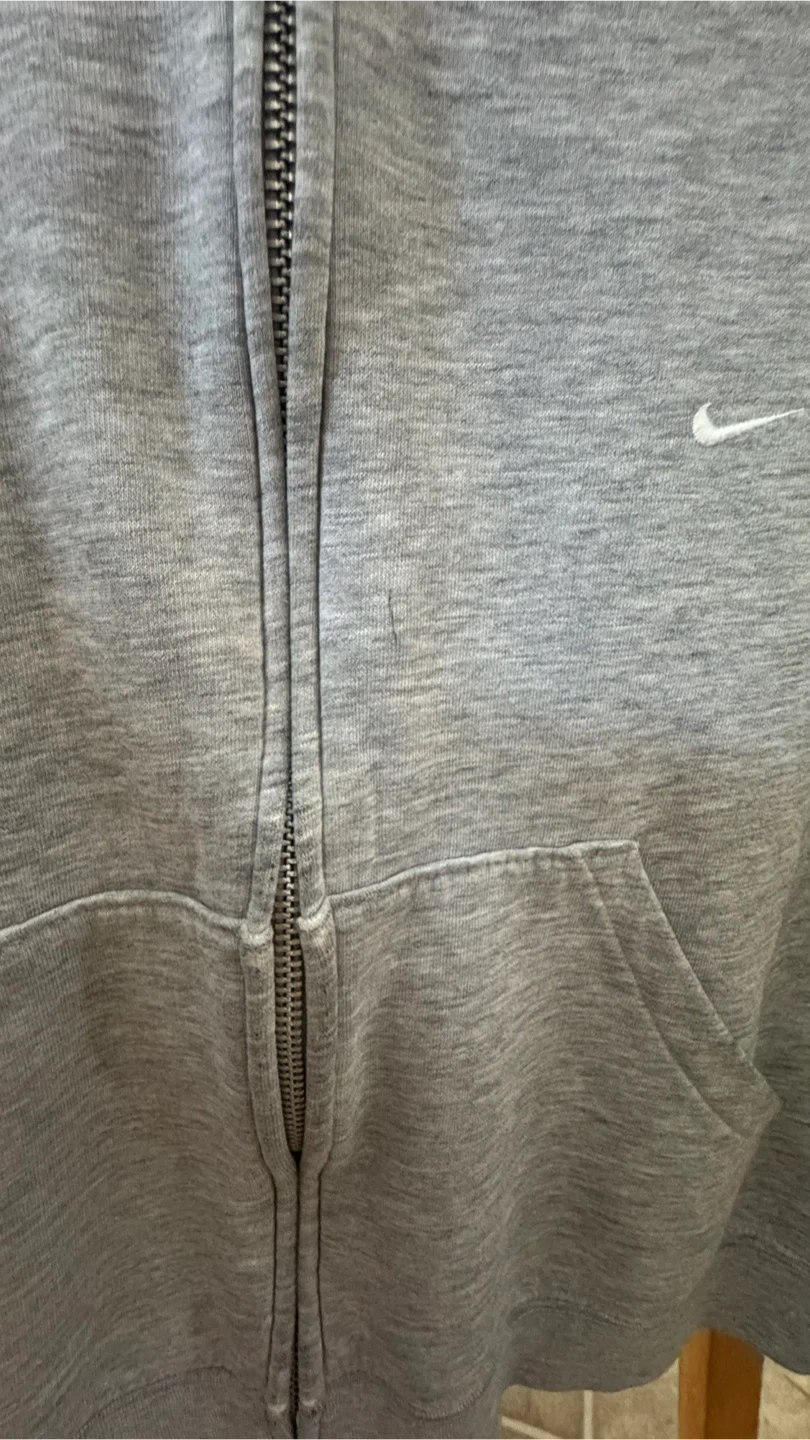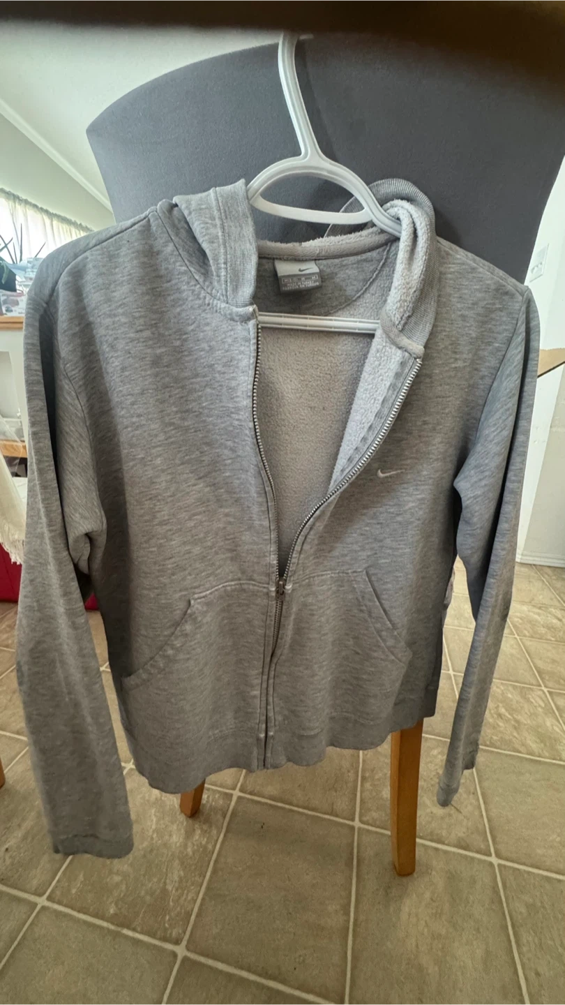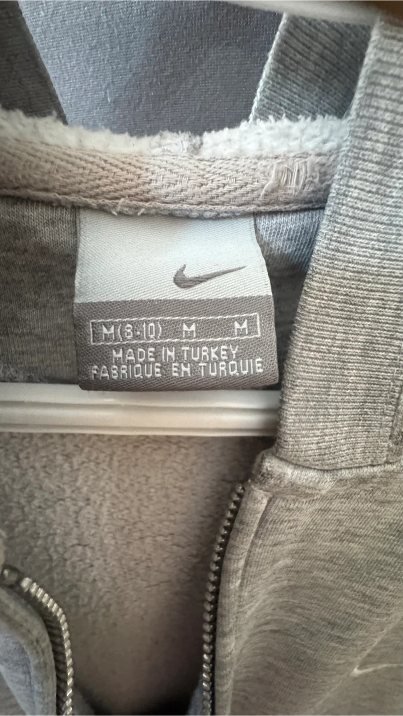 Selling a Nike grey zip-up hoodie in size medium (8-10). It's in good condition and perfect for layering or wearing on its own. The hoodie features a full zip, two front pockets, and the classic Nike swoosh logo. It's made in Turkey.